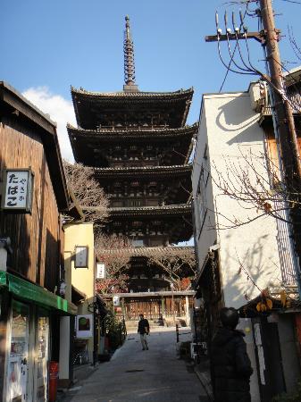 臨済宗建仁寺派の寺院で境内自体は狭いため、「八坂の塔」は寺全体を指す通称にもなっています。現存の五重塔は15世紀の再建ですが、創建は592年に聖徳太子が如意輪観音の夢告により建てられた説と、渡来氏族、八坂氏の氏寺として建てられた説とがあるそう。立派にそびえるその姿は遠目から見ても美しいだけでなく、中に入る事も可能。