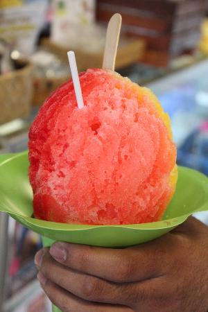 元は日用雑貨店だったという「松本シェイブアイス」。シェイブアイスとは「かき氷」のことで、日本ではおなじみのものです。シロップはホームメイドで、39種類もあります。コンビネーションフレーバーは、好きなシロップを3つ掛けられるというもの。