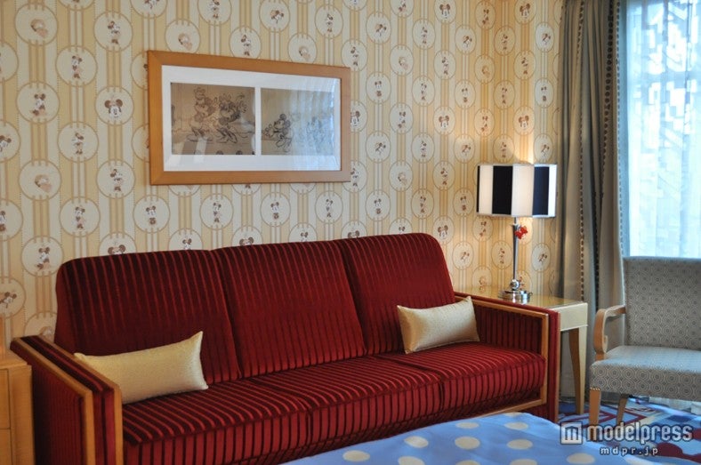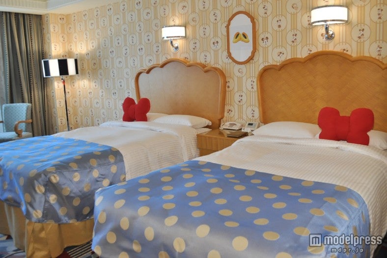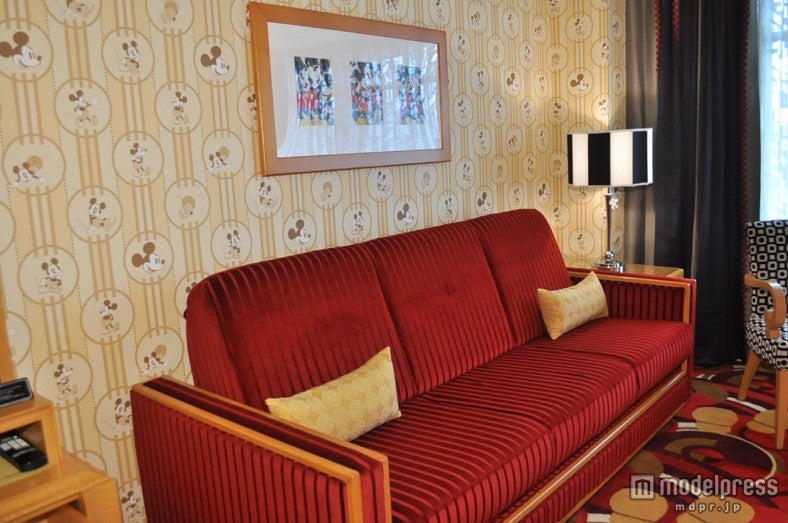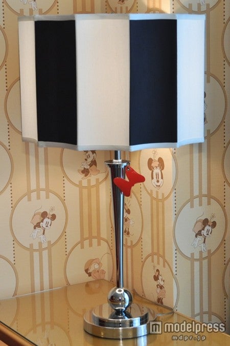 一方、ミニーマウスルームは、ミニーのドレスのドット柄がデザインされたベッドスローが印象的。ミニーのイメージカラーでもある赤やピンクを全面に押し出すのではなくリボンを象ったクッションをアクセントに、清潔感溢れる大人女子もくつろげる空間を実現した。