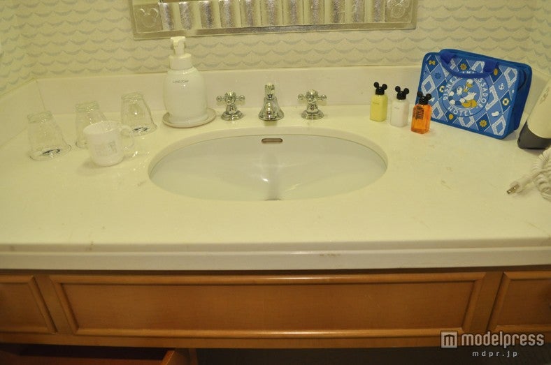 洗面所は淡いブルーカラーを基調とし、ミッキーマウスルームと同様、専用のポーチが付いたミニーマウスのアメニティが用意されているほか、壁紙やドアにもミニーが登場し、ミニーづくしのキュートかつ爽やかな客室へと仕上がっている。