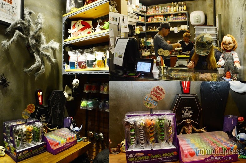 まずお店に入ると大きなE.T.がお出迎え。店の外まで漂う甘い香りにつられて、店内は若い女性客であふれています。黒やグレーのダークな色使いの店内は骸骨やリアルな毒グモ、ホラー映画の有名キャラクターで埋め尽くされたインテリアが外国人にもうけ、アメリカ米軍の方もよく訪れるそう。