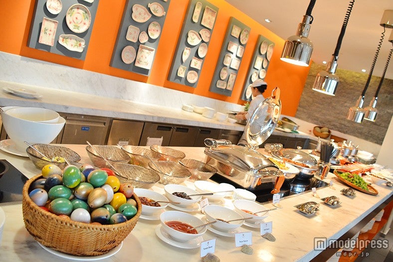 「Angsana Lang Co」は、リゾート全体のスタイリッシュさもさることながら、朝からスパークリングワインが飲み放題という素敵なおもてなしがあることでも人気を集めています。朝食ビュッフェ会場の「Market Place」では、ベトナム料理、洋食、中華に加えて、スパークリングワインのボトルがまるごと冷やされており、朝からとても贅沢なひとときを過ごせます。
