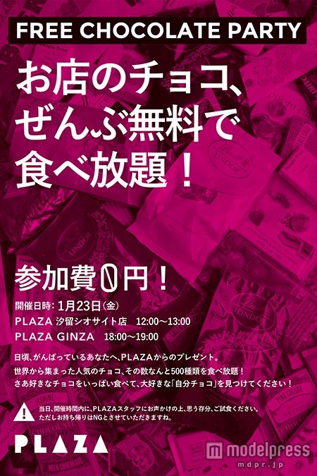 また1月30日~31日は、outletを除くPLAZA、MINIPLA全店舗で、スイス生まれのチョコレートが食べ放題となる企画も予定されている。(女子旅プレス/modelpress編集部)
