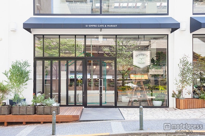 空間全体でここだけのライフスタイル空間を表現している「SI・EMPRE CAFE&MARKET」では、テーブル席の周りに観葉植物など緑を至るとところに配して、自然を身近に感じるやすらぎの空間を演出。