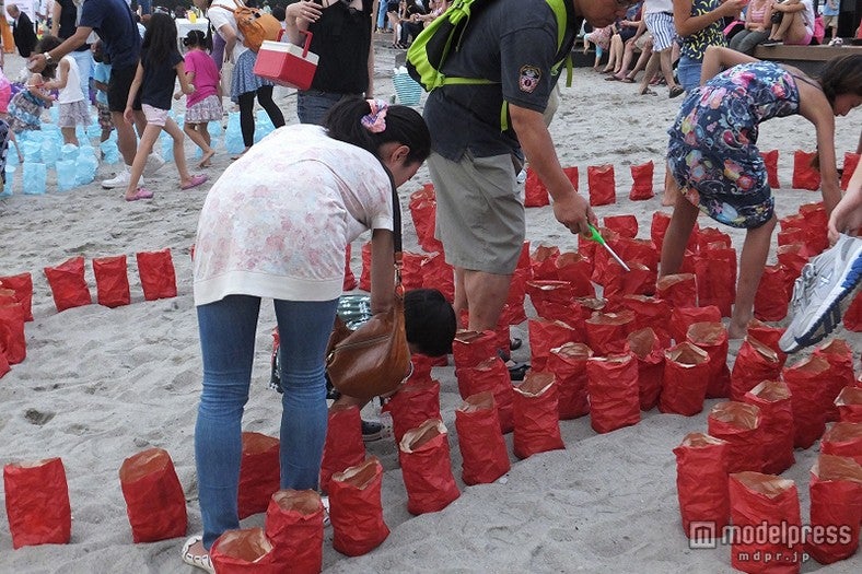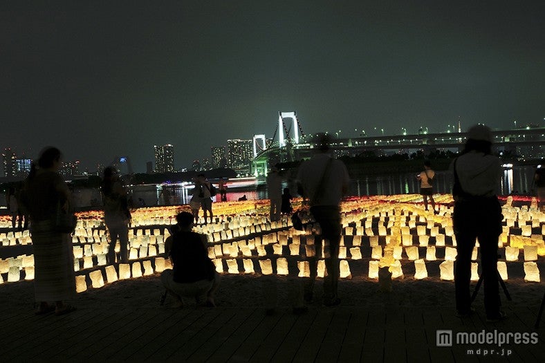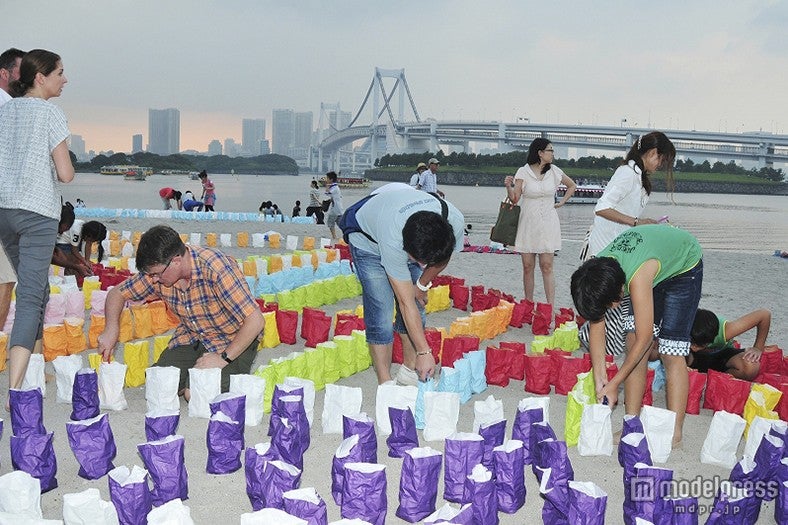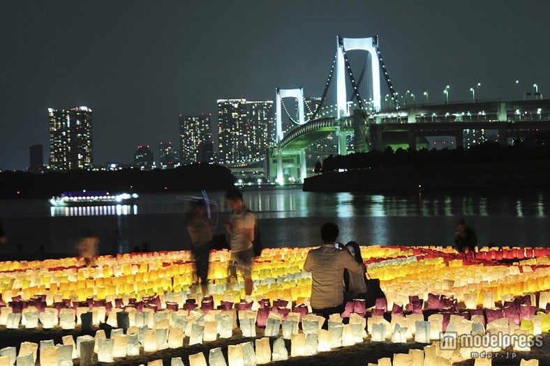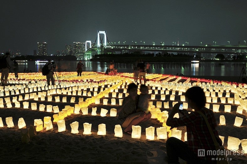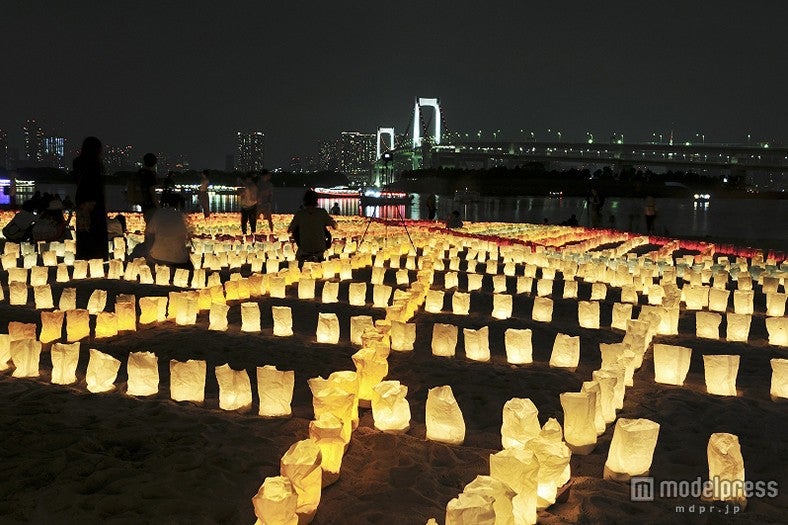 今年12回目の開催を迎える「海の灯まつり in お台場2015」は、海の日を記念して毎年開催されるお台場の夏の風物詩。今回は「日本の伝統文化でおもてなし」をテーマに、おだいばビーチにロウソクを使ったペーパーランプを並べて点灯し、光の地上絵を描き出す。
