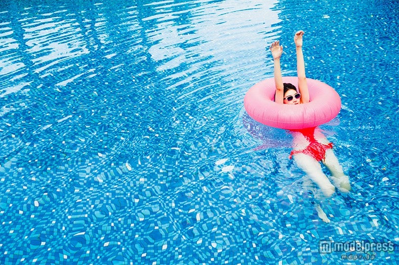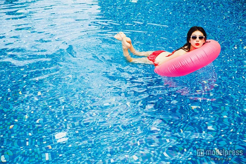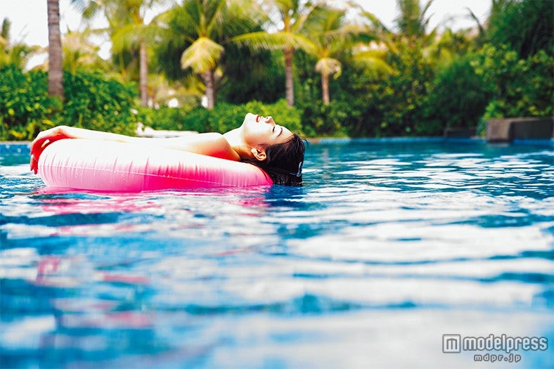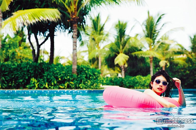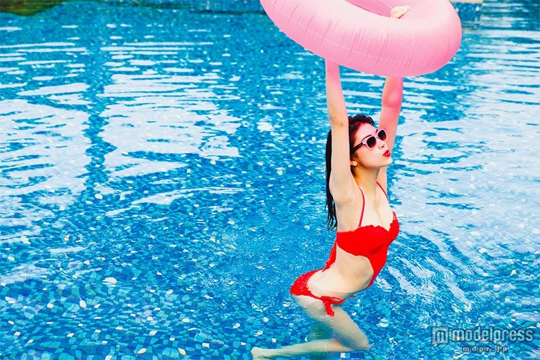 今号の撮影が、意外にも初めてのバリ滞在だという森。誌面では、現地の5ツ星ホテル「THE MULIA」のプールにて、水面がキラキラと輝く様子が美しい、真っ青なプールに映える鮮やかなレッドの水着姿で、様々な表情を見せている。