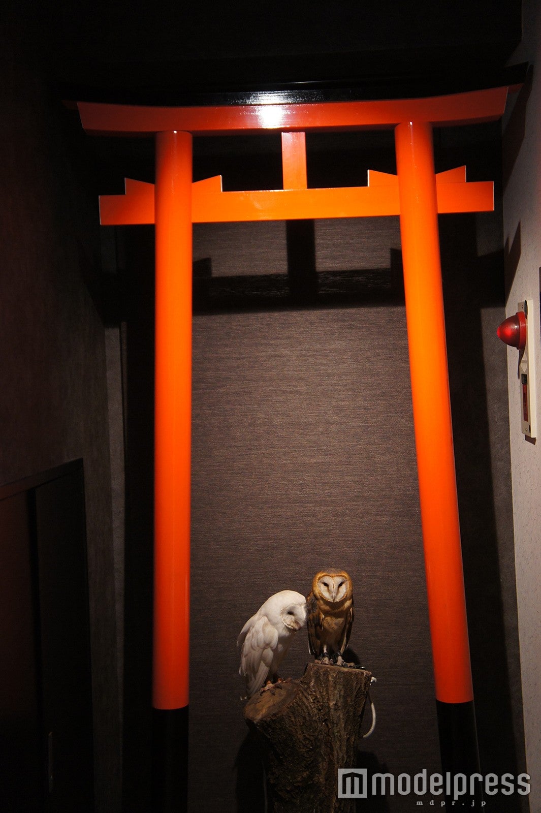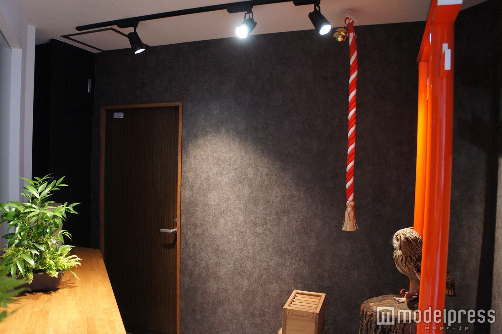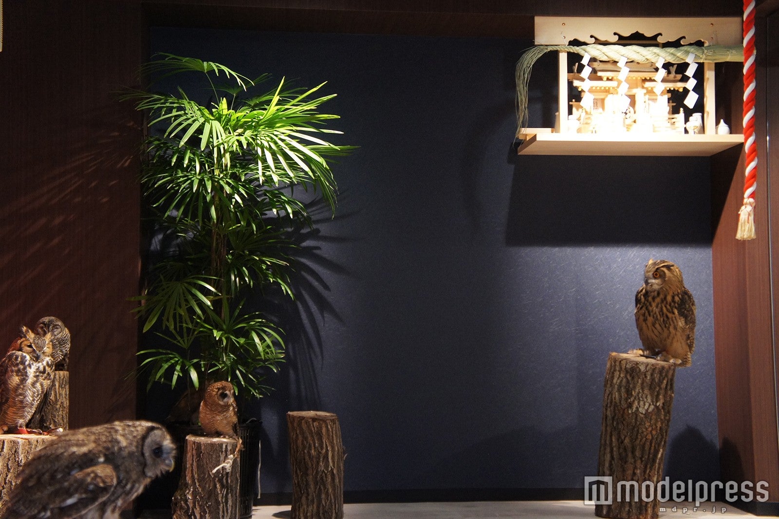カフェ店内は神社・仏閣が多い地元浅草の立地の雰囲気を壊さないよう、神社をイメージした鳥居や神棚を設置したり、壁紙にも朱色や藍色・白・黒と和紙調のものを導入して空間演出をしており、これまでのふくろうカフェにはない幻想的な内装に。