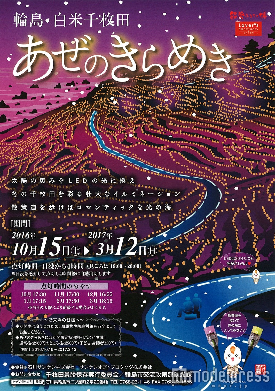 石川県輪島市の国指定文化財名勝・白米千枚田に約21,000個のソーラーLEDを設置し、毎晩イルミネーションを灯す「あぜのきらめき」が2017年3月12日(日)まで開催されている。