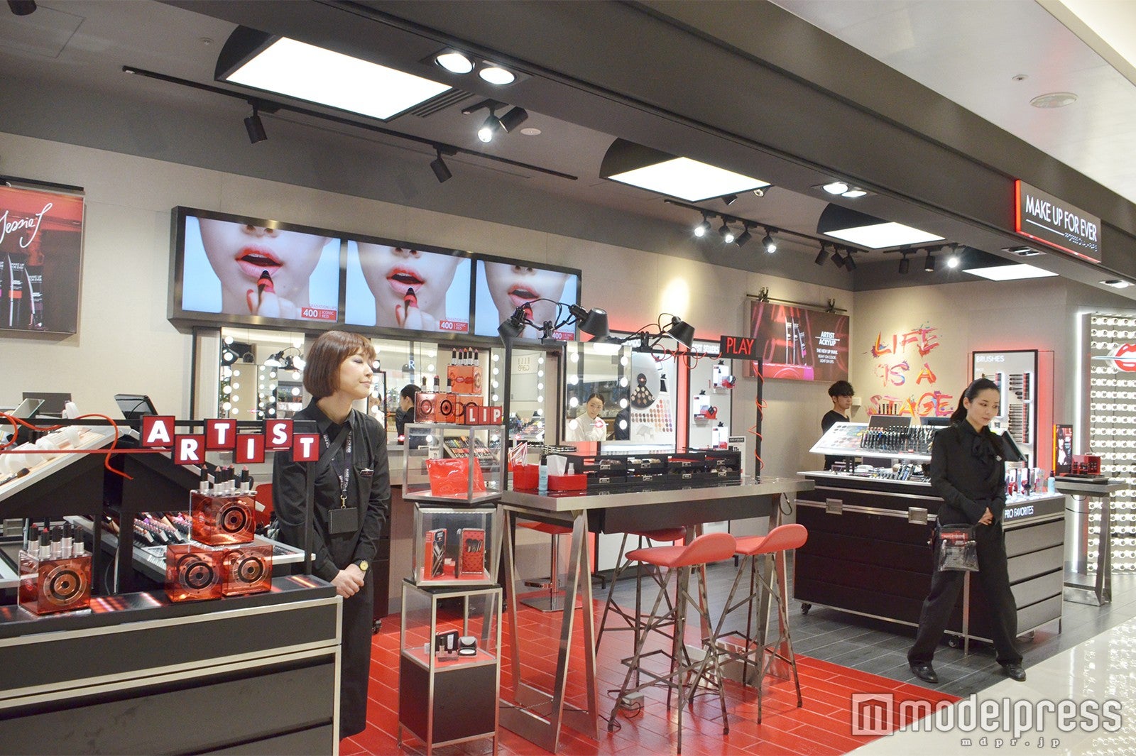 「メイクアップフォーエバー」は、同ブランドのイメージモデルを務める歌手のジェシー・Jの楽曲をヘッドフォンで聴きながらコスメを試せるという、音と視覚の両方でブランドの世界観を伝えるユニークなデイスプレイが特徴。