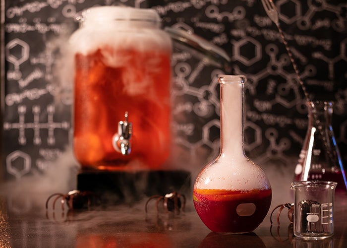 バーを蜘蛛の巣や科学室を彷彿とさせる装飾で実験室のようにデコレーションした空間で、通常の個性豊かなカクテルに加え、試験管やフラスコ、ビーカーなど驚きのスタイルで提供する、ユニークなカクテルを7種類ラインナップ。