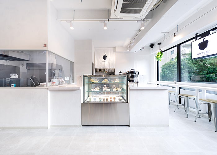 白を基調とした店内からは、代官山アドレスの木々を眺めることができ、開放感に富んだ空間が広がっている。
