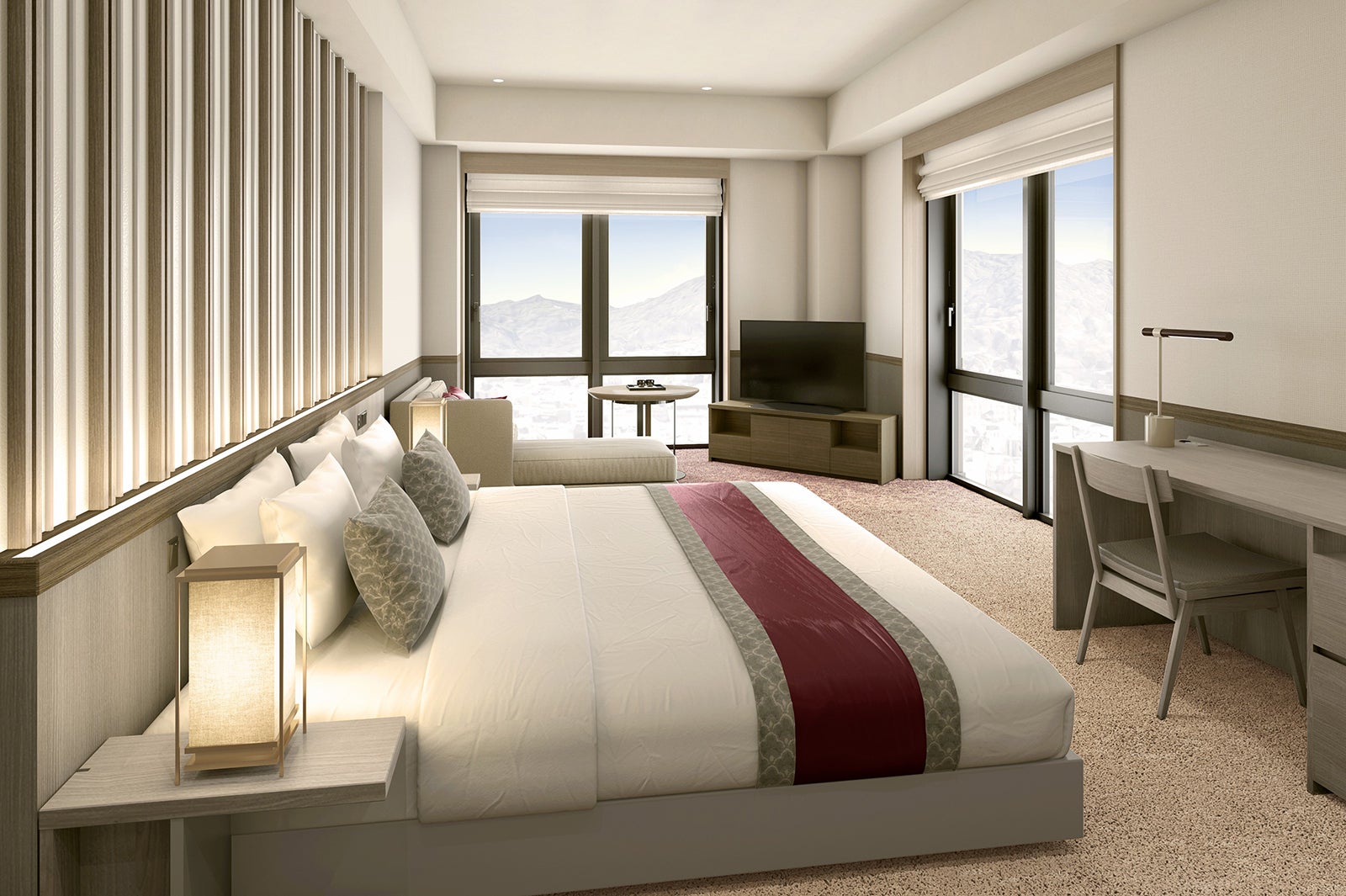 近代建築文化の芽生えと当時の意匠を現代に引き継いだ唯一無二の空間で、高い天井や開放感のある大きな窓など、かつての教室の面影を残す客室で、くつろぎの時間を過ごせる。