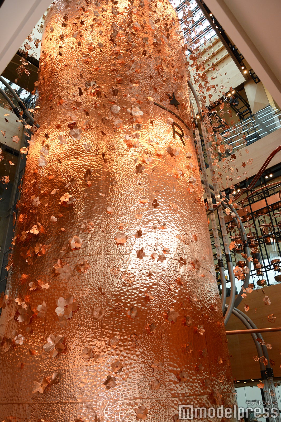 天井まで届くほど高いキャスクは、世界のロースタリーの中でも最長の高さ約17メートル。淡く赤みを帯びた銅板のキャスク表面には、職人が一枚一枚手作業で仕上げた2,100枚もの桜の花びらが舞い、春の中目黒のように華やかな印象を与えている。