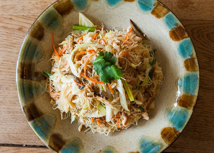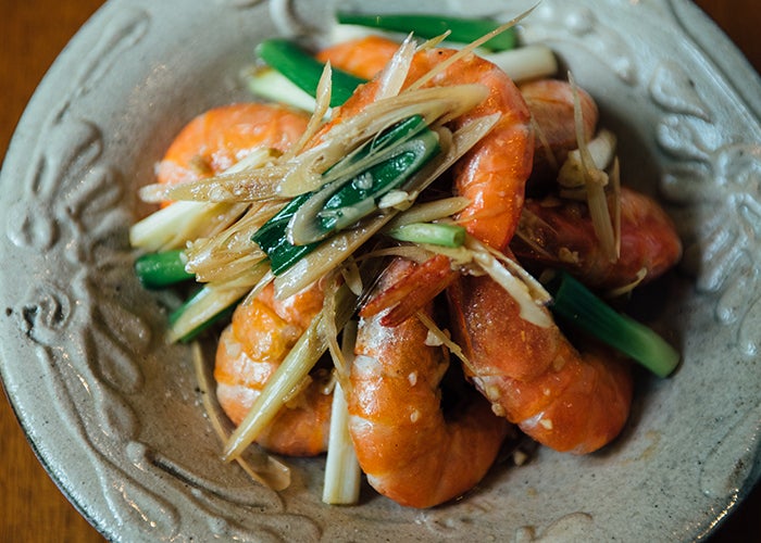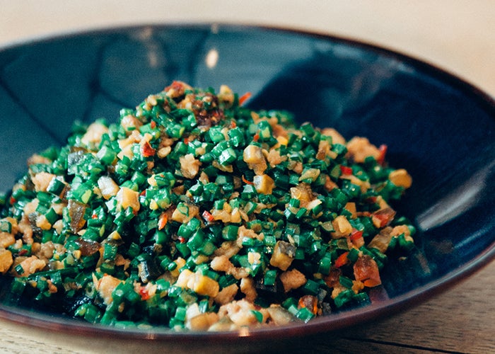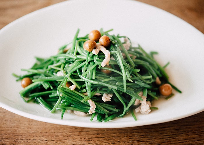 代表的なメニューのひとつが、「松花蒼蠅頭(花ニラと豚ひき肉とピータン 豆鼓のピリ辛炒め)」。花ニラの香りが食欲をそそり、豚ひき肉とピータンの旨味が後をひく人気の一品で、ほとんどのテーブルが注文するほどの名物料理として知られる。そのまま食べても美味しいが、白いご飯とも相性抜群だ。
