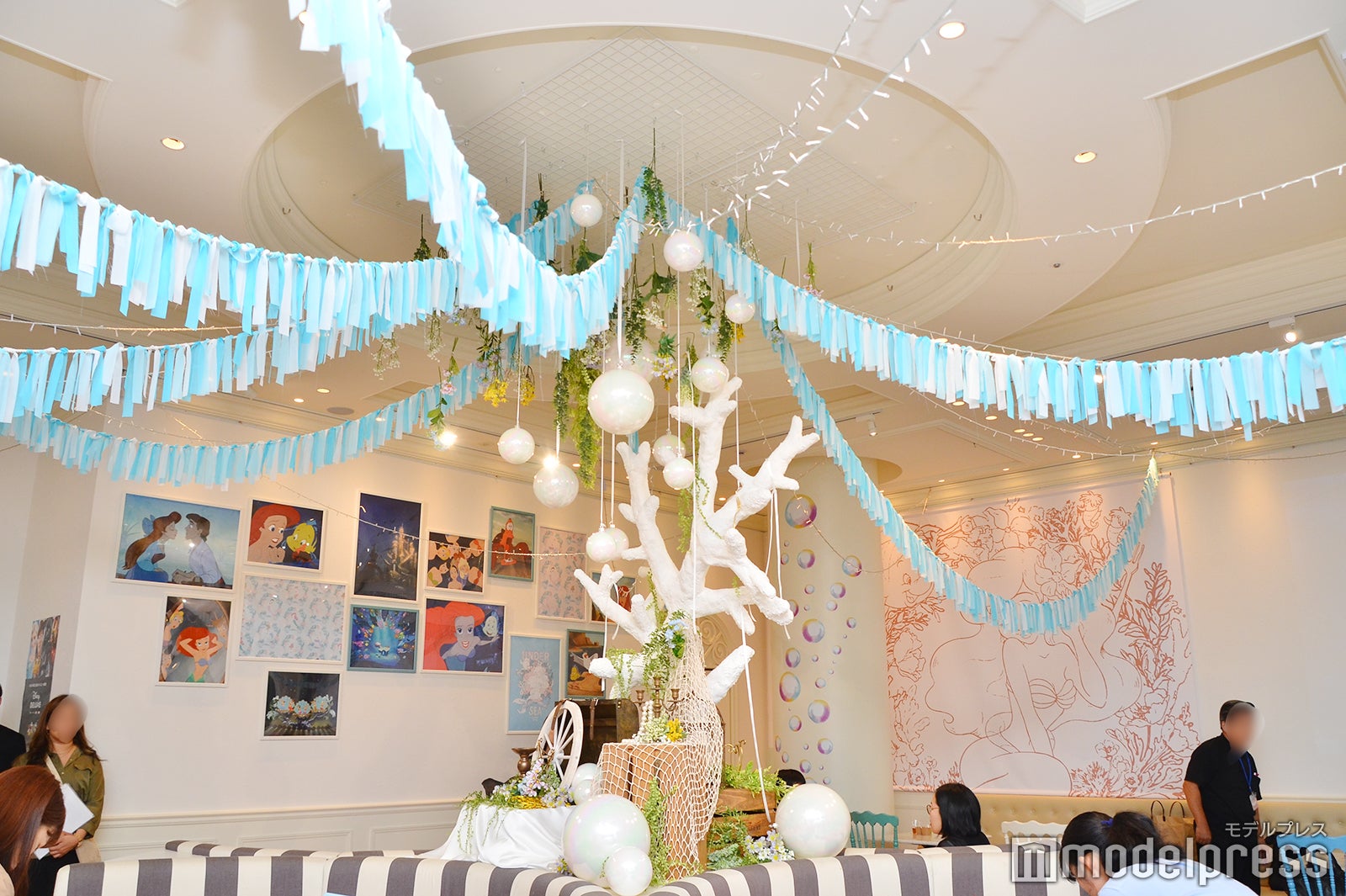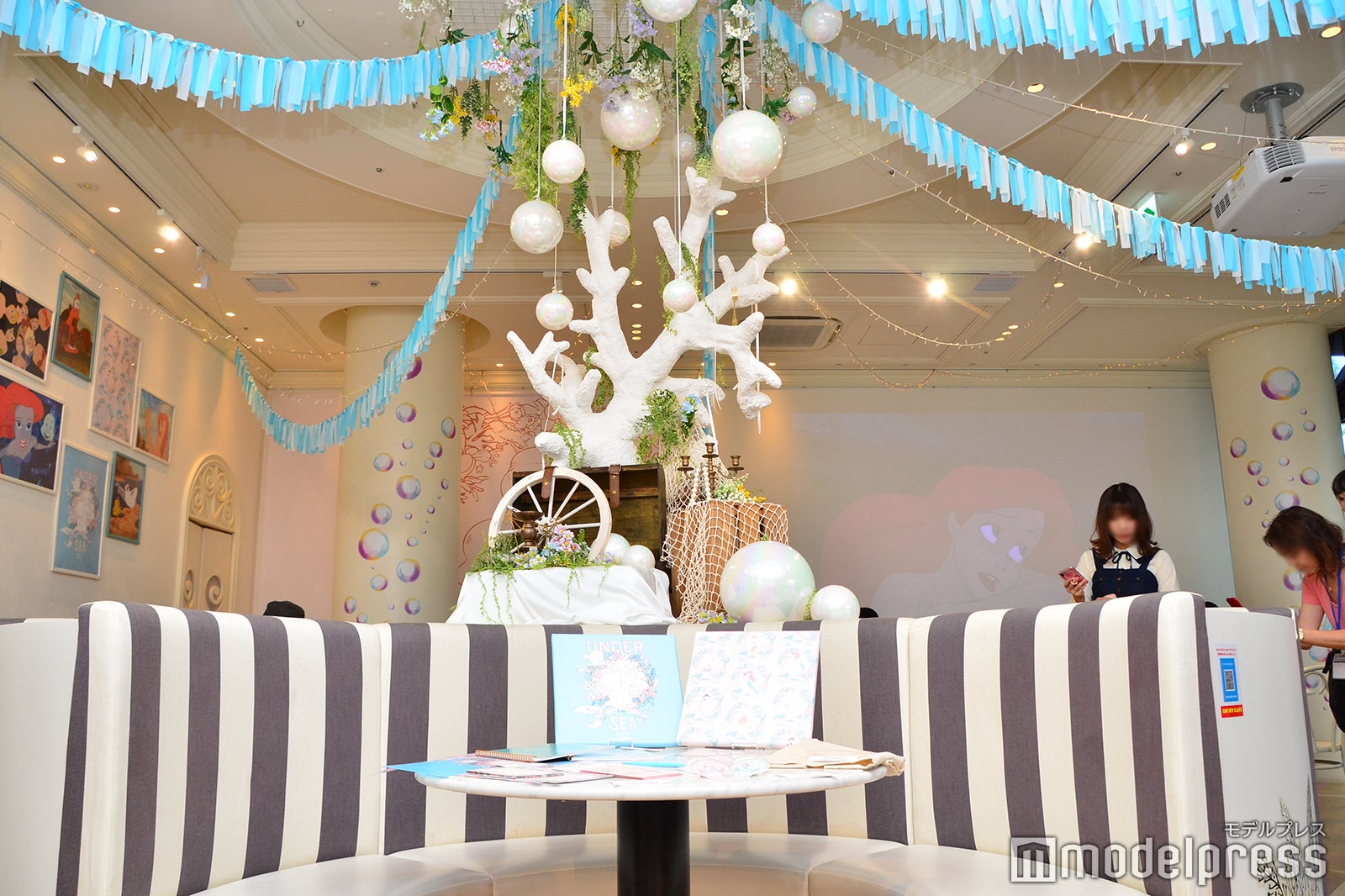 店内中央に巨大なサンゴと船の舵、パールのオブジェを配し、天井には白とブルーの2色のオーナメントとイルミネーションライトを飾りつけて、アリエルが暮らす深海の世界をスタイリッシュに表現。