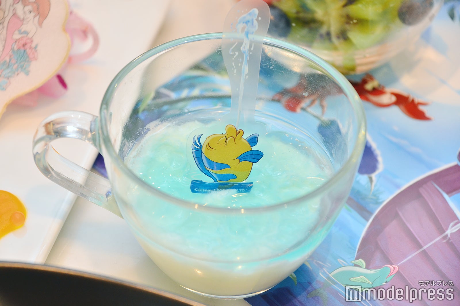 アリエルの一番の友達、フランダーのコロンとしたフォルムがかわいいヨーグルト風味のスムージー。水色のヨーグルトスムージー、黄色のマンゴースムージーがたゆたう波のように注がれており、2つを混ぜても美味しく味わえる。