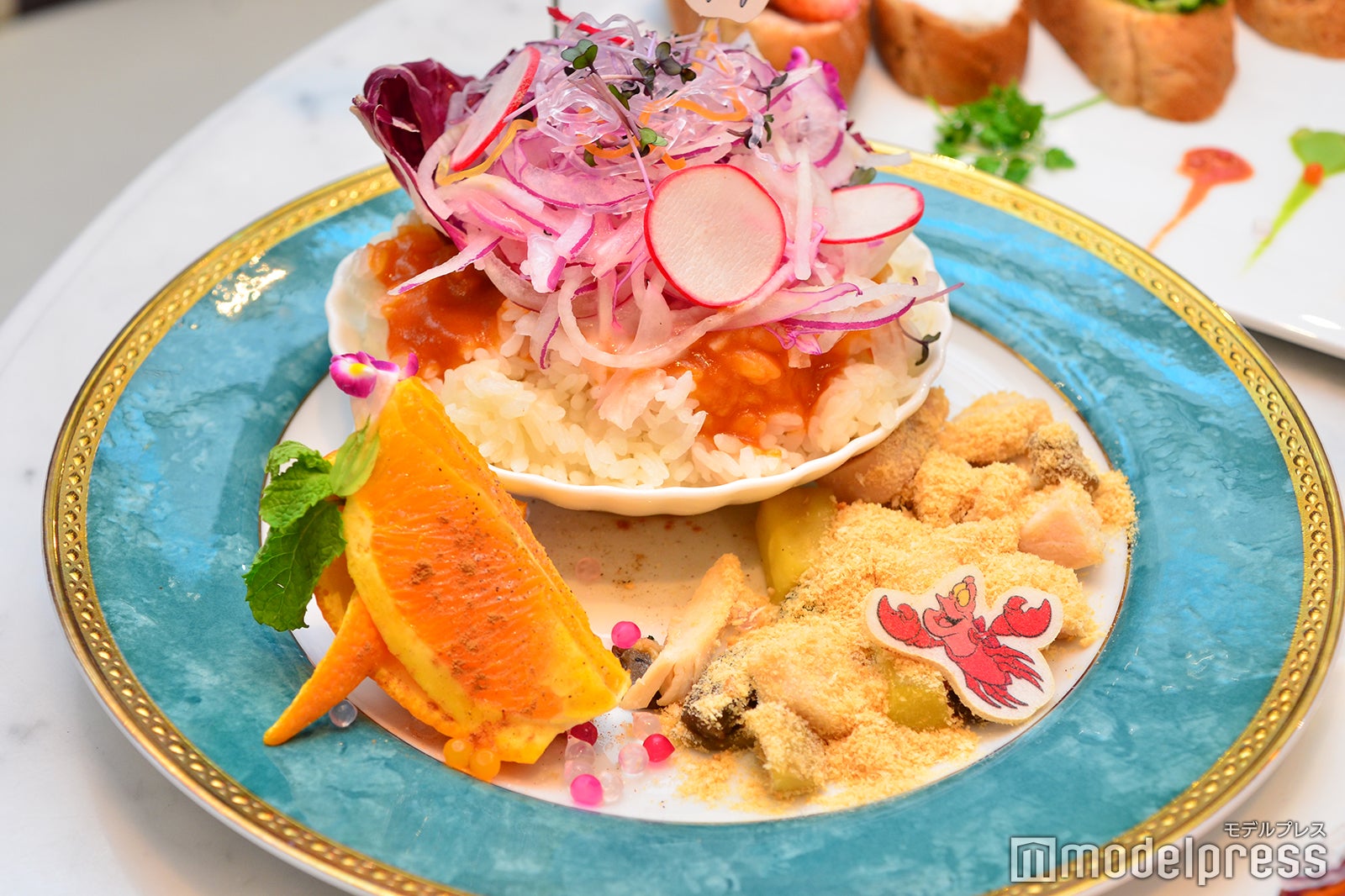 浜辺をイメージしたクリームリゾットはよく見るとアリエルの宝物が…?監視役のセバスチャンもこっそりのぞいている。また、ライスと野菜の間にはエビ風味のソースをしのばせた。