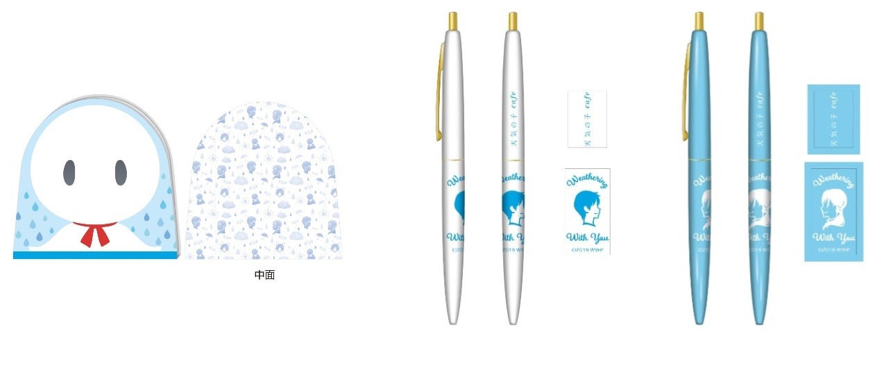 またオリジナリティあふれるカフェ限定グッズも。雨つぶステッカーやマットスクエア缶バッジ、アクリルマグネット、てるてる凪のメモ帳、BICボールペン、キラキラ雨ふりスマートフォンケースなど、豊富に取り揃える。