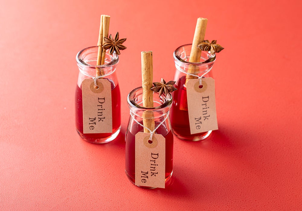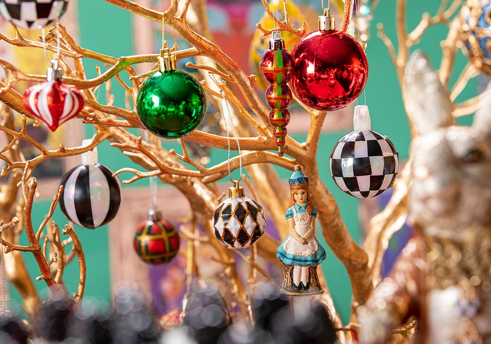 クリスマスらしい赤とゴールドを基調に、トレンドのチェック模様や格子柄、そしてカラフルなクリスマス・オーナメントで溢れる空間で味わえるのは、アリスの定番、帽子屋をモチーフにしたテリーヌショコラで作る『ハッター』や、ハートの女王様のスカート風に仕上げた『ハートの女王様の太っちょオーナメント』、キャラメリゼした林檎とキャトルエピスを効かせたスパイシーガナッシュが絶妙な『アリスのクリスマス・アップルリース』、定番ストロベリーショートケーキにアリスらしいイタズラ心を加えた『クリスマスショートケーキ・ア・ラ・アリス』など。
