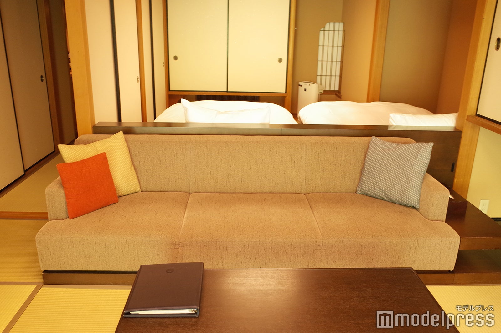ちなみに「箱根寄木の間 清流リビング付き和洋室」は、定員3名まで宿泊可能なので、家族や仲の良い友人同士でのグループ旅行にも最適。ローソファで寝転がってだらだらおしゃべりをしたり、お部屋に備え付けのジェンガやオセロで遊んだり、自由な思い出作りの場となるリビングスペースが広めに造られているところもポイント。