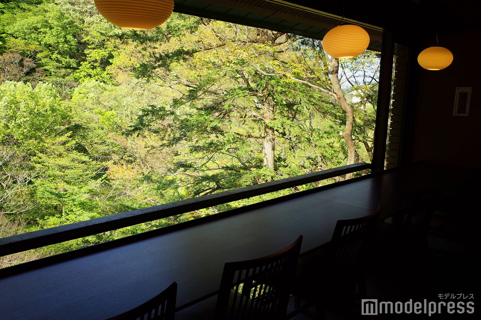 新緑の時期は、青々とした樹々を、秋はもえるような赤や黄色の紅葉…と、季節によって表情を変える山川のパノラマビューを、寛ぎを重視して開発したオリジナルローソファと窓際のカウンター席のどちらからも眺められます。