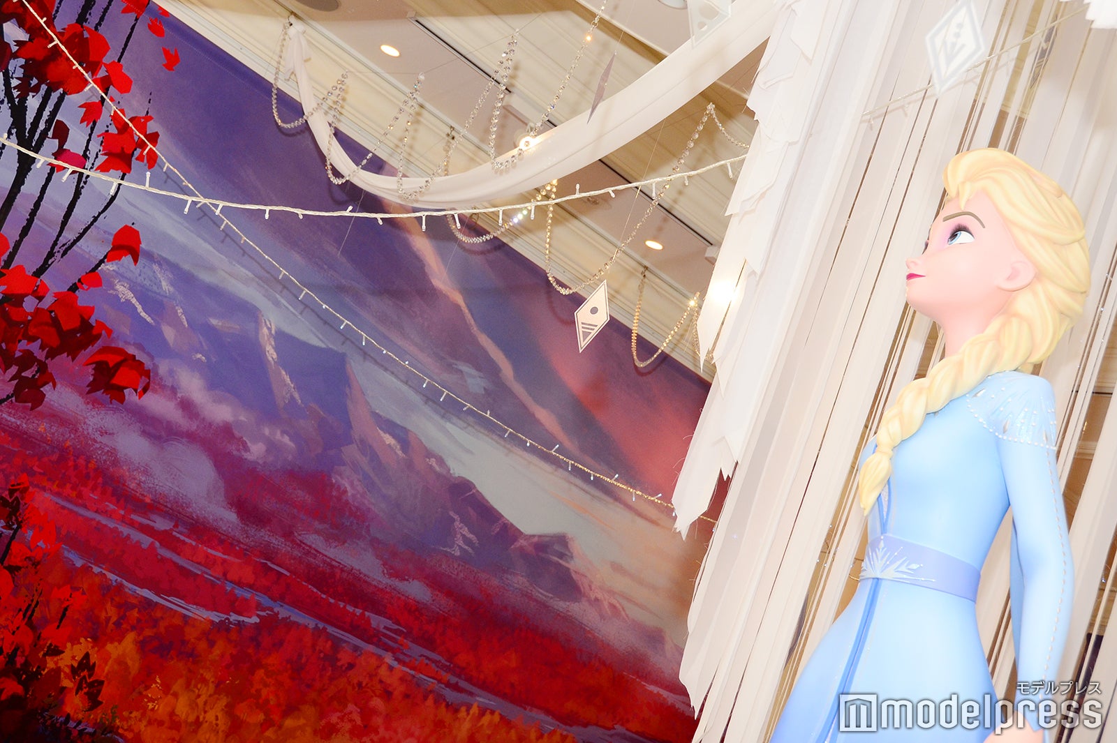 店内の一部ウォールや支柱には『アナと雪の女王2』でエルサとアナが訪れる魔法の森や落ち葉が舞う様子が描かれ、前作には描かれなかった“秋”を感じさせる空間が広がっている。