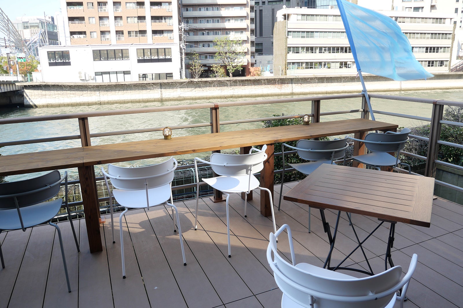 土佐堀川を見下ろすリバービューのテラス席と屋内のカフェスペースがあり、東京よりもゆったりした空間で腰を据えてフルーツサンドやハニートースト、プリンアラモード、パフェ、ボトルドリンクなどを味わえる。(女子旅プレス/modelpress編集部)
