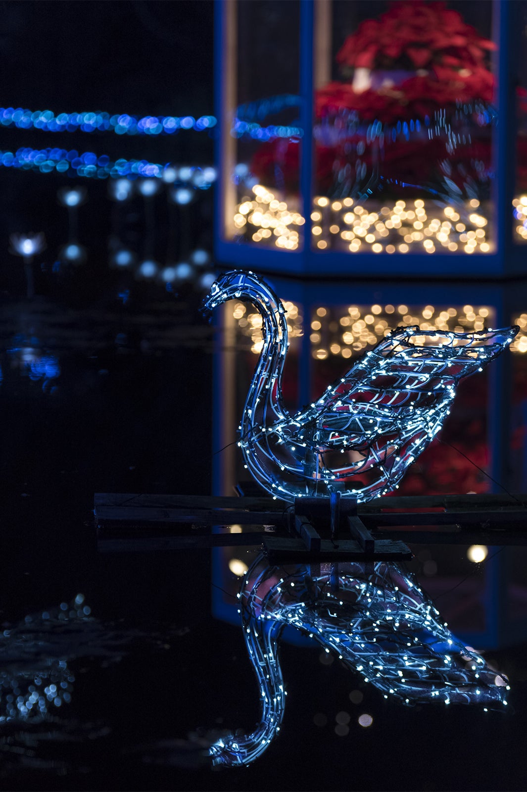2019年より、新作イルミネーション「光のふじのはな物語」が初公開。4月中旬から5月中旬にかけて園内にある、うす紅藤(さくら色)、大藤(紫)、白藤(白)、きばな藤(黄色)の4色の藤が、まるで絵巻物のように移ろいながら咲く姿を表現したイルミネーションで、水面に映りこむ姿も幻想的だ。