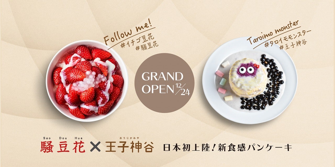 行列のできる台湾スイーツ専門店「騒豆花(サオドウファ)」が2019年12月24日(火)、台湾発のパンケーキ専門店「王子神谷」(オウジカミヤ)とコラボレーション。タピオカをトッピングしたパンケーキを展開する「王子神谷」は、日本初上陸となる。