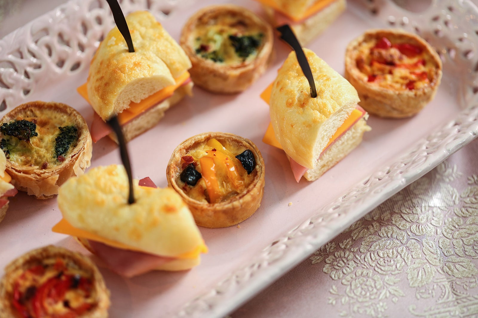 【Food Buffet】ヘルシーチキンと五豆と五穀のカップサラダ お好みのフレーバーで/カラフル野菜の小さなキッシュ/本日のスープ2種/ミニハンバーガー/チーズベーグルのピンチョスサンド/チェッカーサンドウィッチ/スナックチキンフリット
