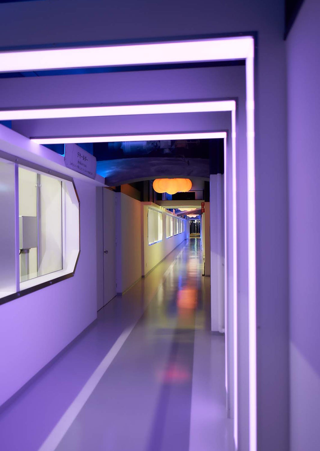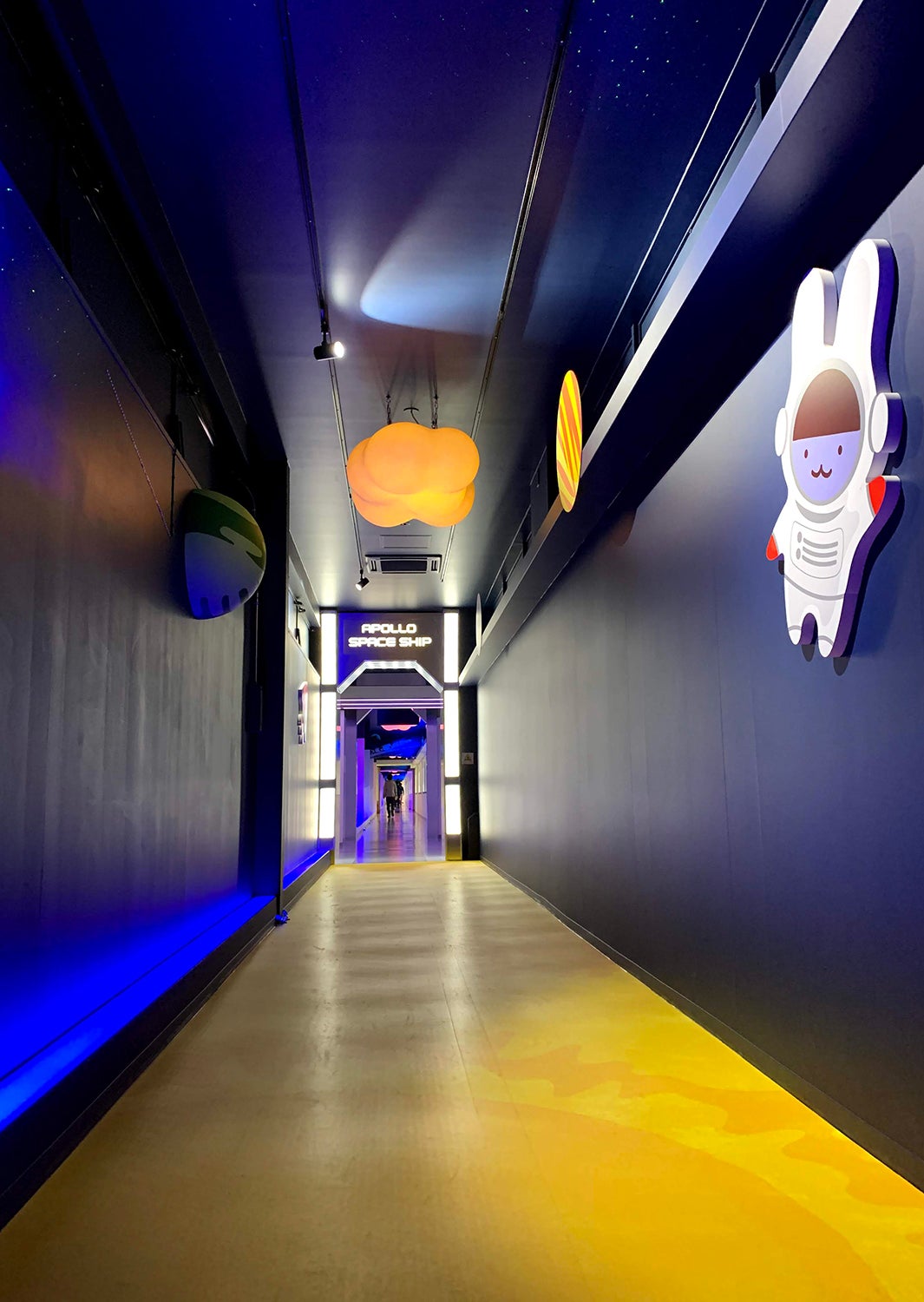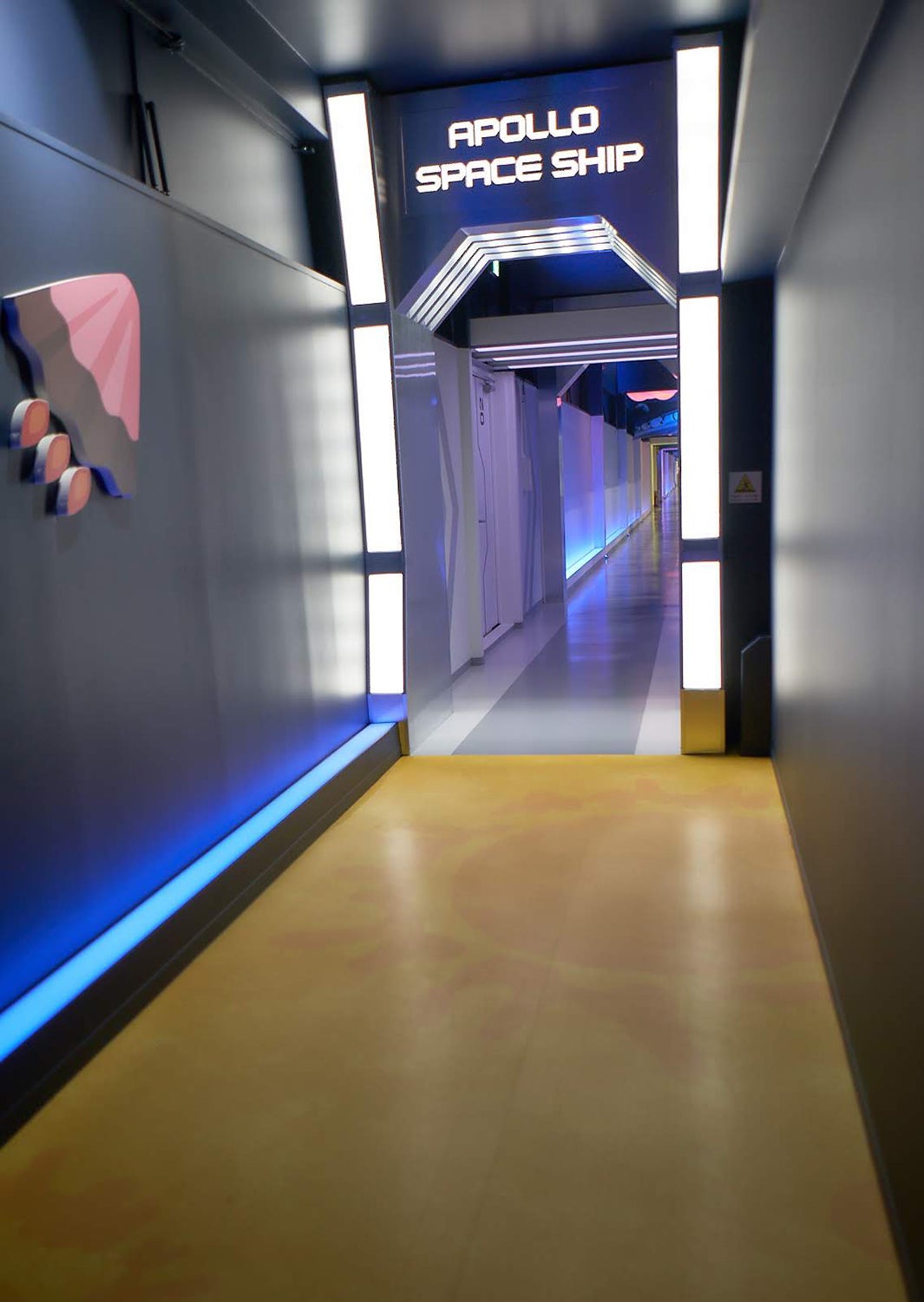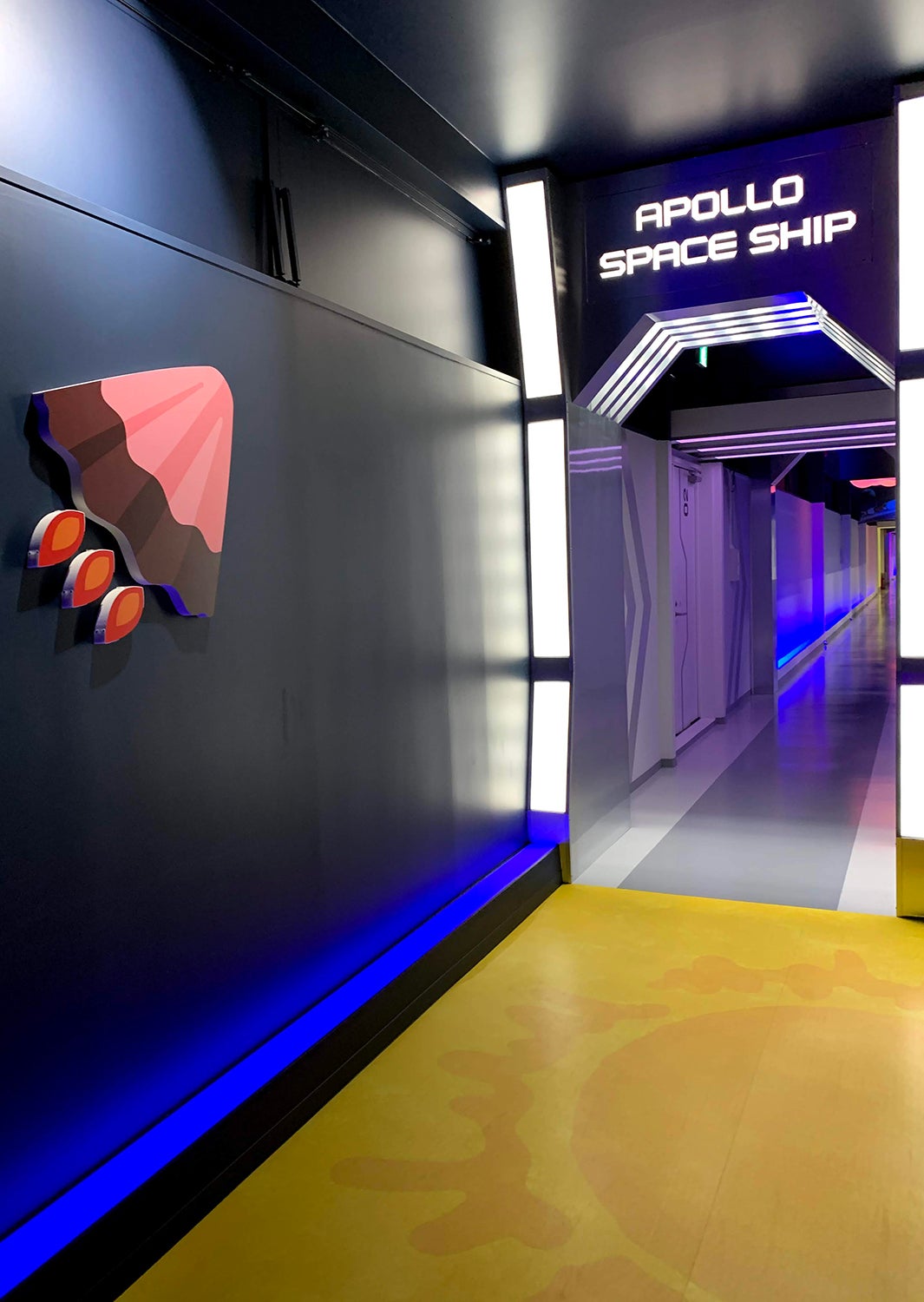 はじまりの【プロローグゾーン】には、月面から宇宙船に乗り込む演出空間が広がり、見学ライン上にも宇宙服を着た“アポロちゃん”やロケット、惑星のモチーフを散りばめ、青・紫系の神秘的な照明で空間をライトアップ。