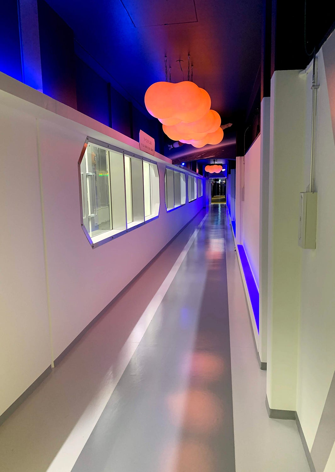 【製造ラインゾーン】の宇宙船のゲートをくぐると、まるで宇宙船の内部から「アポロ」の成型から包装まで一連の製造ラインを眺めているような見学ができる。