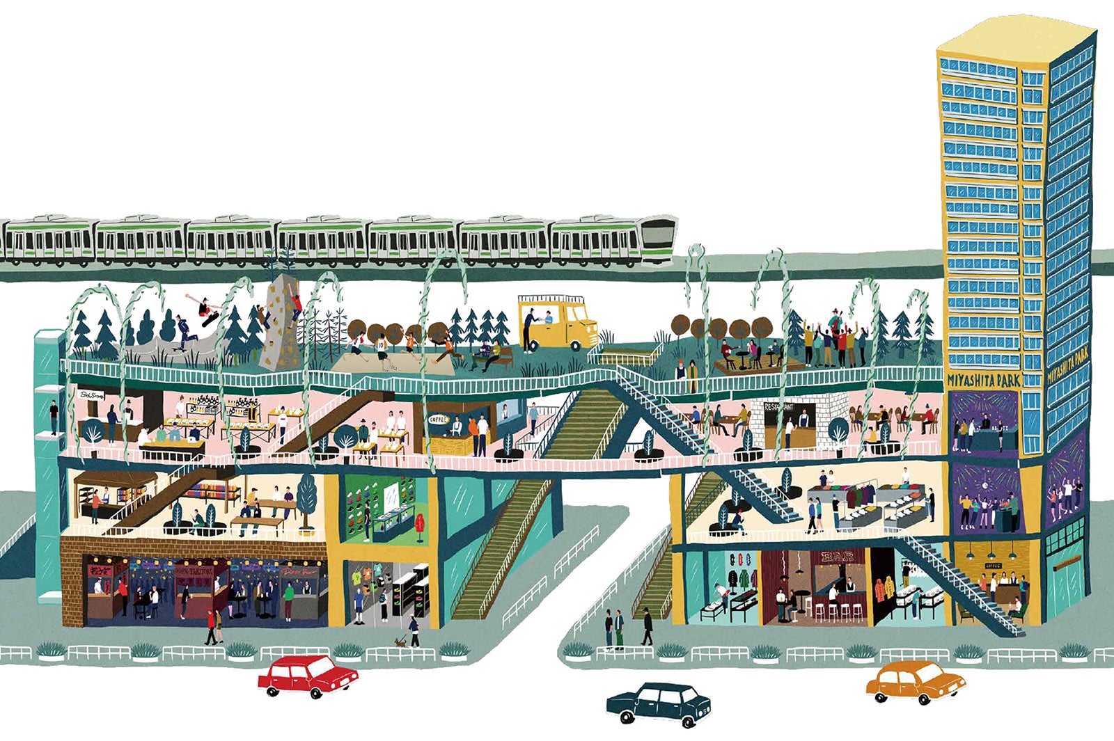 「MIYASHITA PARK」は、敷地面積約10,740平方メートルに及ぶ、公園・駐車場・商業施設・ホテルが一体となった新しい“低層複合施設”で、JR渋谷駅からJR原宿駅方面へ伸びる線路沿いの約330mに渡り再開発を実施。