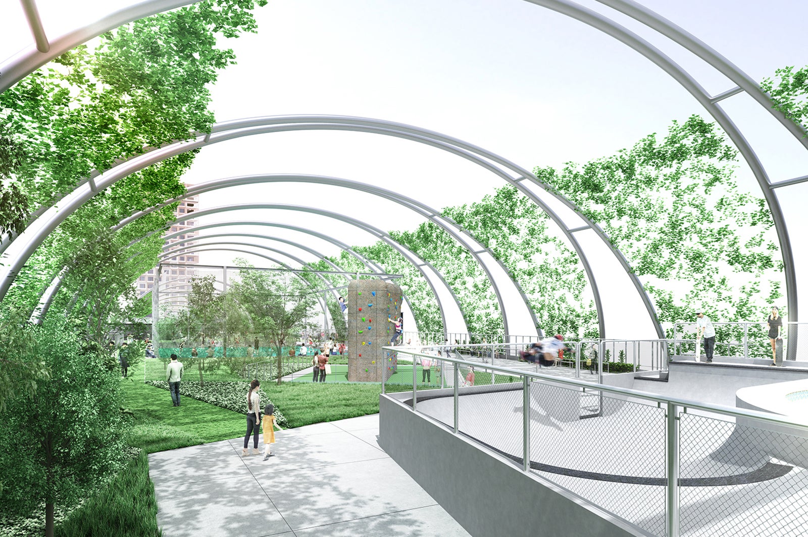 これまでの宮下公園は、南街区・北街区の2つに分かれていたが、再開発後は道路上空も含めて公園として一体化。