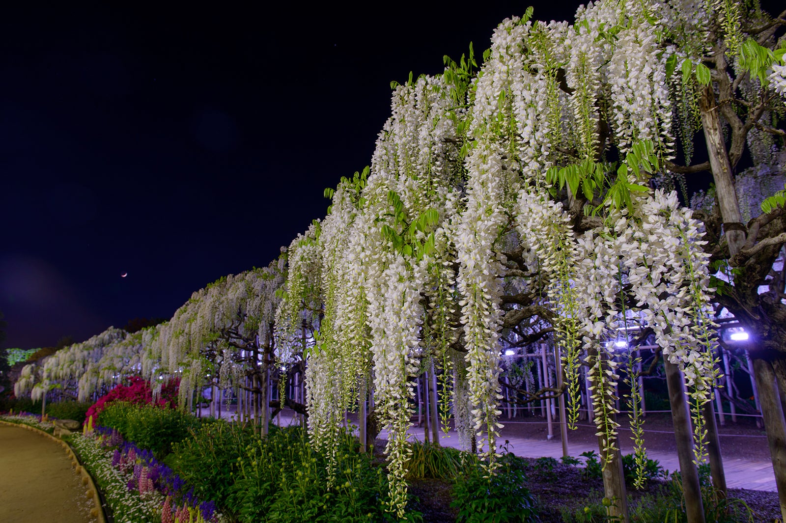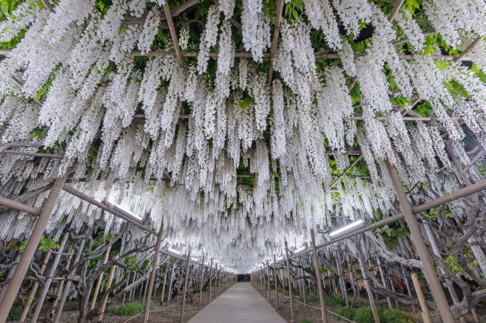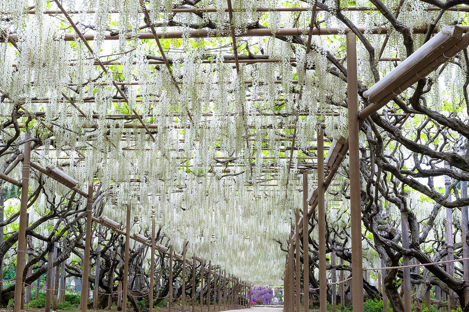 樹齢150年におよぶ600畳敷きの藤棚を持つ大藤や、長さ80mもの白藤のトンネル、さくら色の目映いうす紅藤、純白の白藤、ビタミンカラーのきばな藤など、350本以上の藤が約1ヶ月間に渡り順番に咲き誇る。