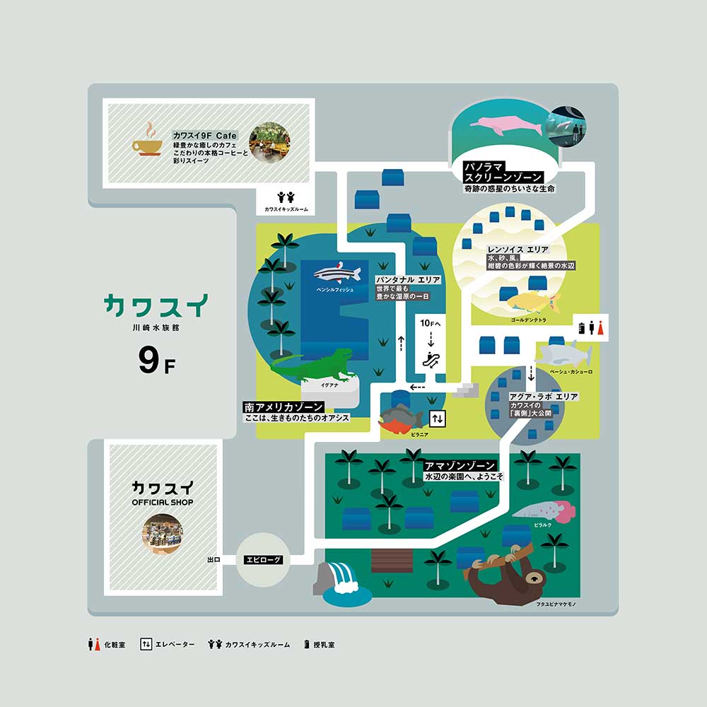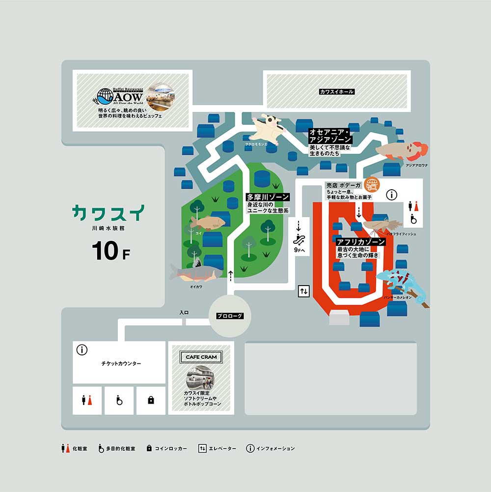 10階エントランスを抜けると「多摩川ゾーン」、「オセアニア・アジアゾーン」、「アフリカゾーン」、9階の「南アメリカゾーン」、「パノラマスクリーンゾゾーン」」、「アマゾンゾーン」と6つの展示ゾーンが続く。