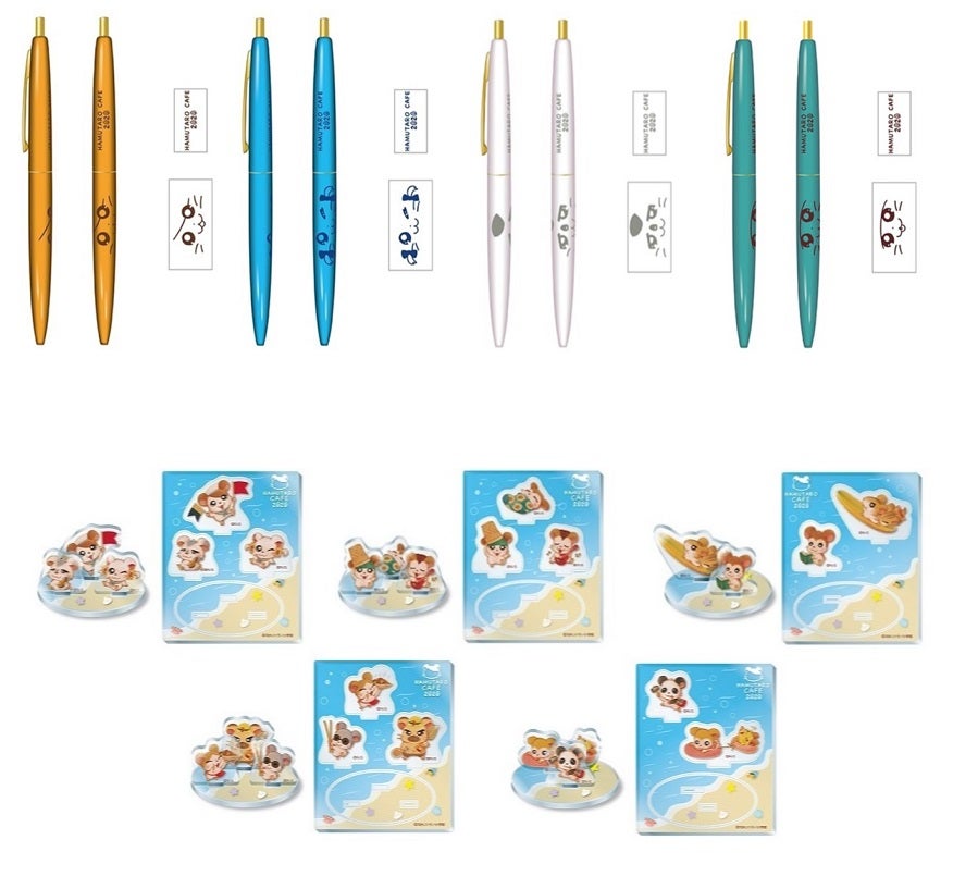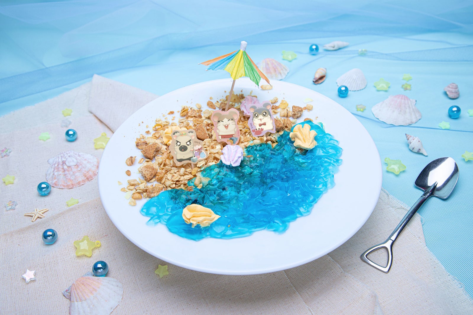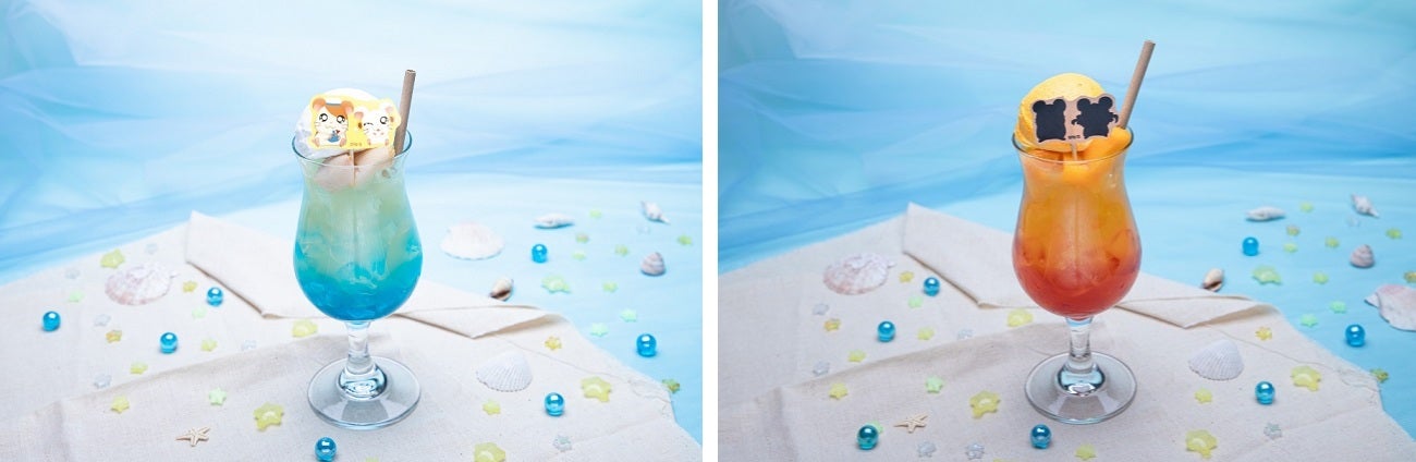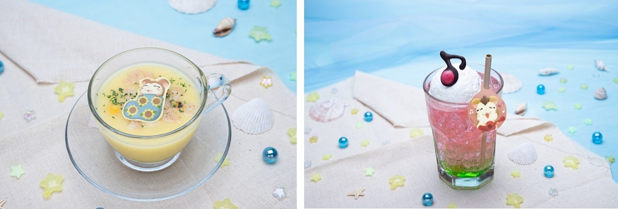 焼きそばとたまごで形作った満開のひまわりを表現した「海の家のひまわり パンのせ焼きそば」や、真っ青なカレーに困り顔のこうしくんが浮かぶ「タネを落としたですぅ~ こうしくん海カレー」、「リボンちゃんのうきうきフルーツパフェ」といった、おしゃれなフードや海の家で楽しめるようなメニューと、8月6日のハム太郎の誕生日に合わせた「HAPPY HAMU HAMU バースデーケーキ」などの他、描き下ろしデザインのカフェオリジナルグッズや特典が登場。