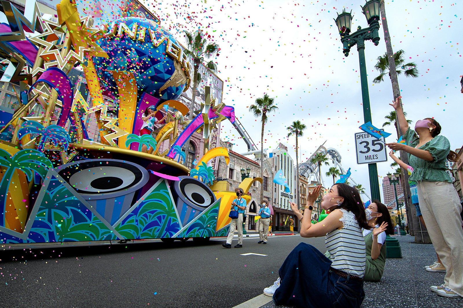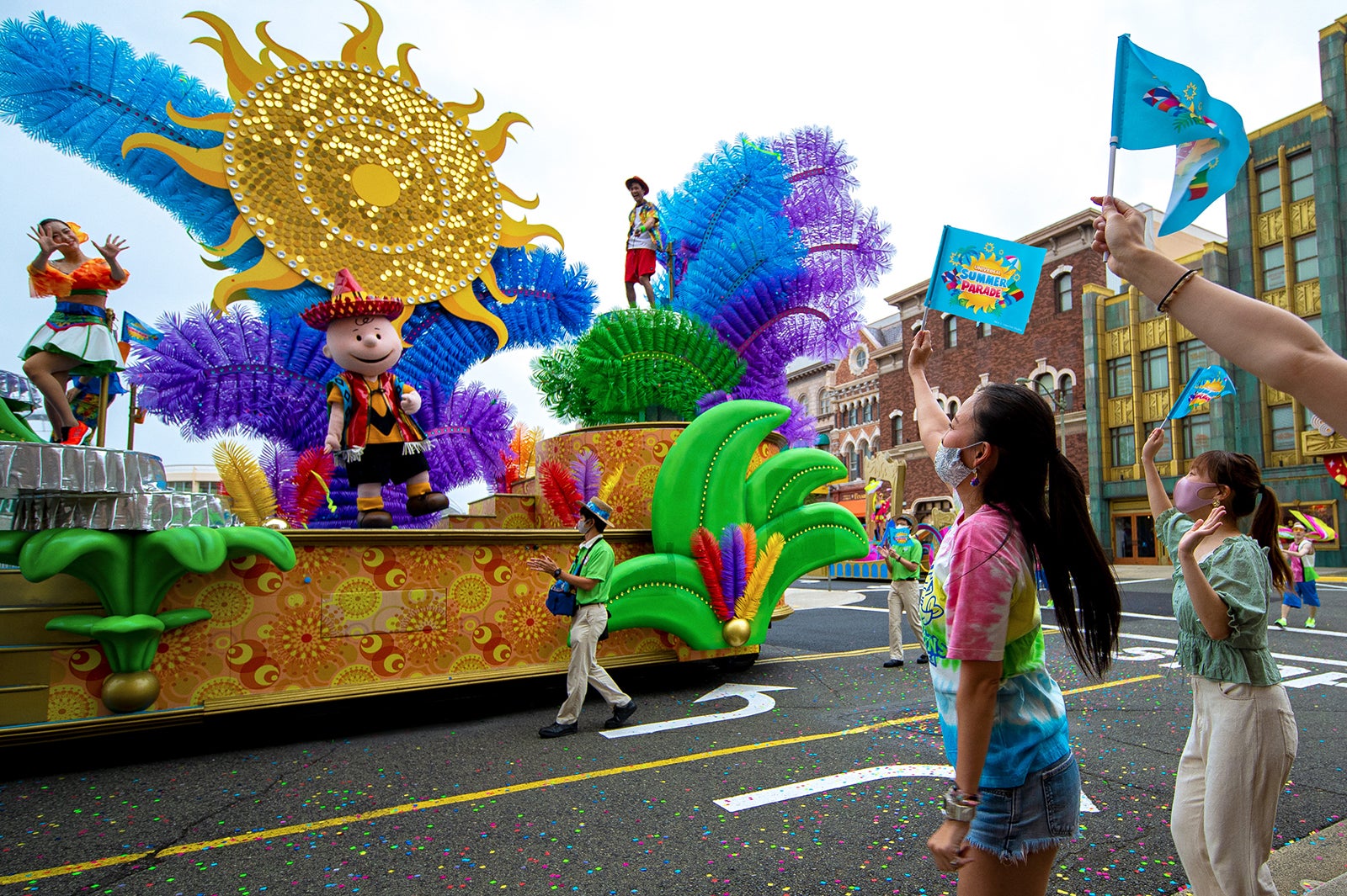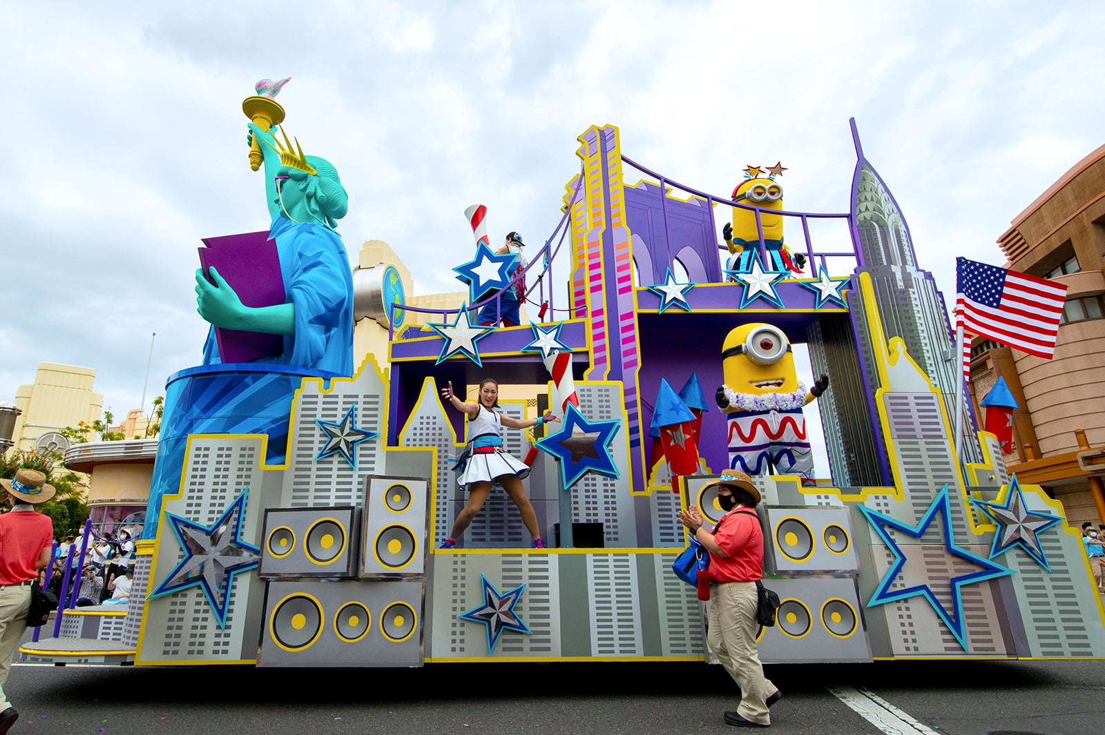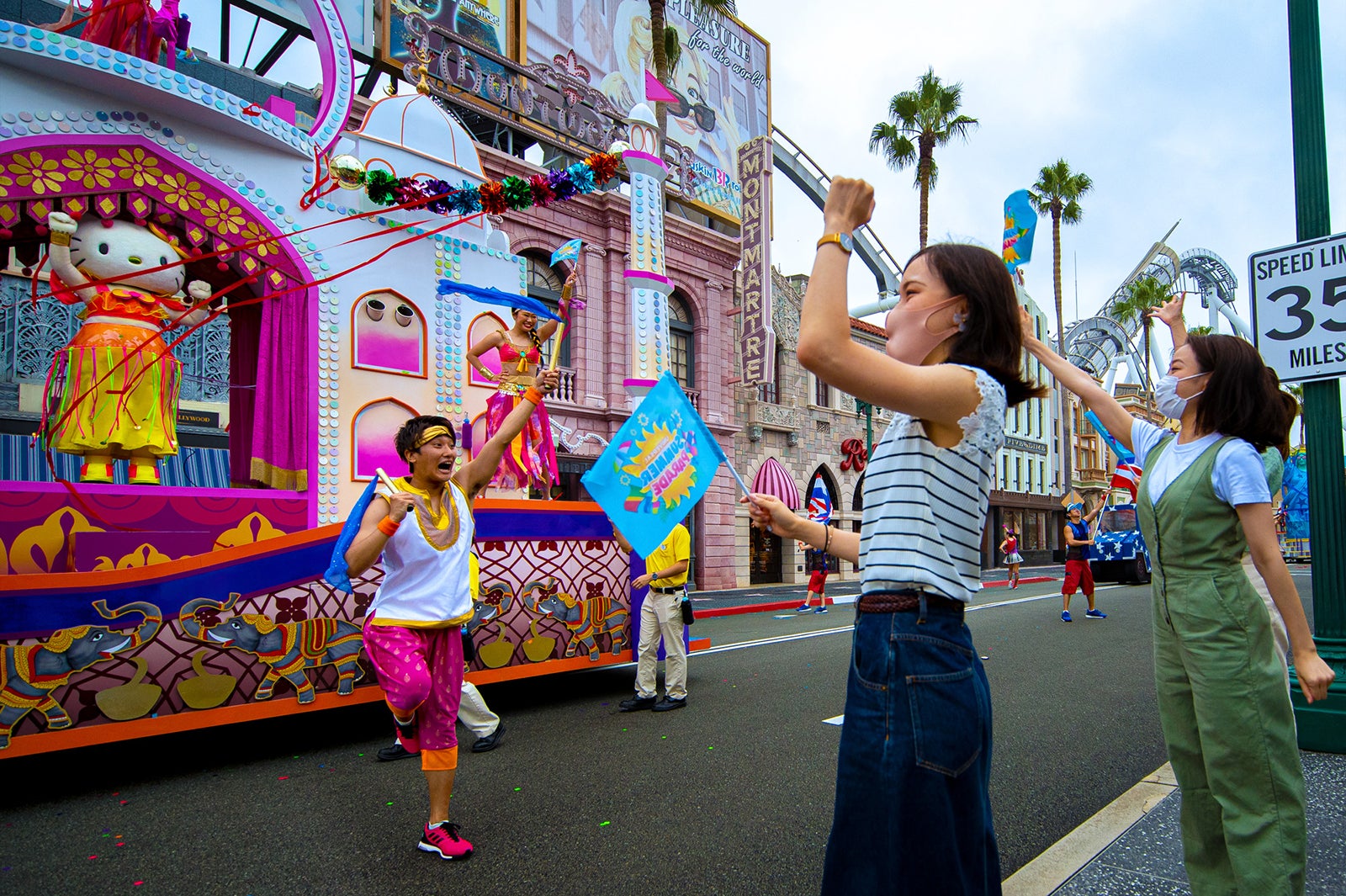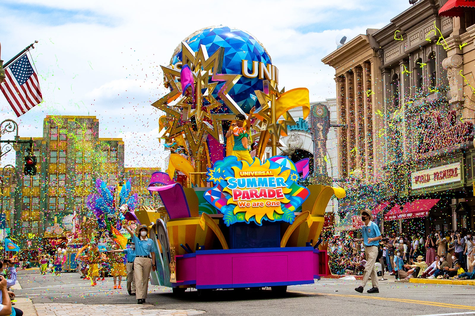 パーク営業再開後、初となるパレード「ユニバーサル・サマー・パレード ~ウィ・アー・ワン~」(7月23日(木)~8月27日(木))は、華やかなフロート(移動式ステージ)に乗ったミニオン、エルモ、スヌーピー、ハローキティなど、夏らしい衣装のパークの人気キャラクターたちと、エンターテイナーたちが、夏気分を届ける豪華なパレード。