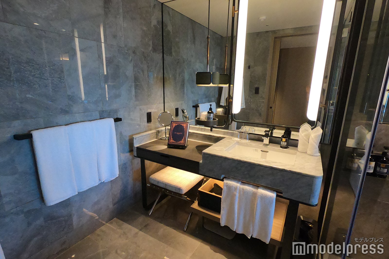 バスルームは全室バスタブ付き。洗面台にある大きな本を開くと、中には歯ブラシやコームなどのアメニティ類が!単にデザインが素敵なだけでなく、こういった遊び心が散りばめられている点も「メズム東京」の魅力。1日の終わりにミネラルたっぷりのエプソムソルトを入れてゆったり入浴して疲れをいやしましょう。