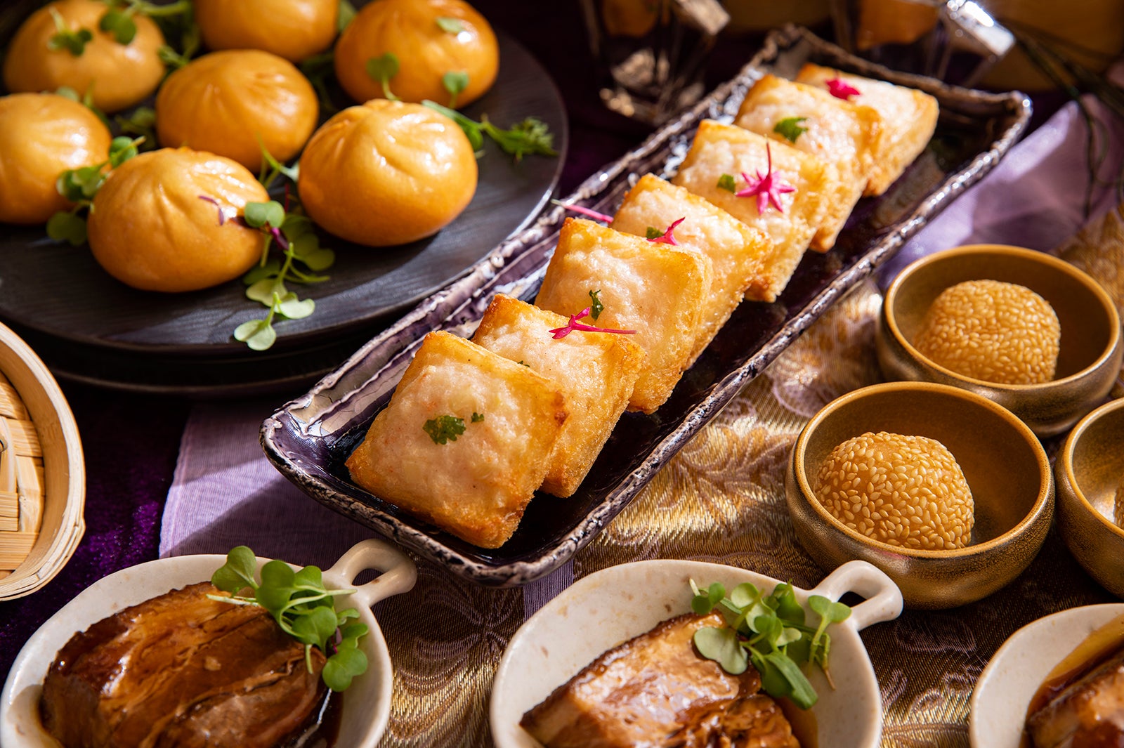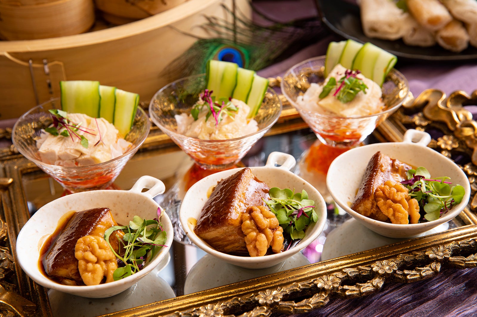 また、点心と共に提供される1人1オーダー限りの“シェフズスペシャル”4品は、様々な若返り術を試み、若さと美貌を保ったことで有名な西太后をテーマに展開。八角とシナモンを効かせ、トロトロになるまで煮込んだ「豚バラ肉の醤油煮込み」には、西太后の食膳に常に上ったと言われる胡桃のクラッシュを添えて。西太后も珍重した真珠粉を贅沢に加えた「紫芋のパールパウダー入りクリームスープ」他、蒸し鶏と白キクラゲの前菜や胡麻団子を用意する。