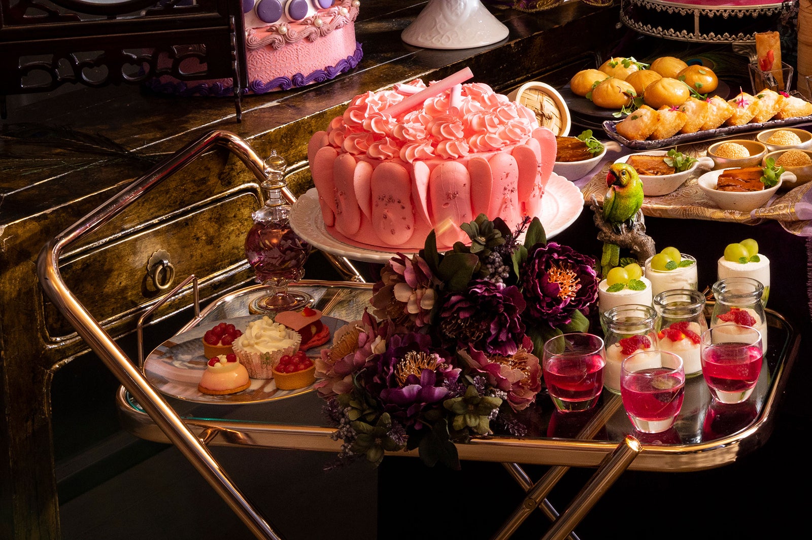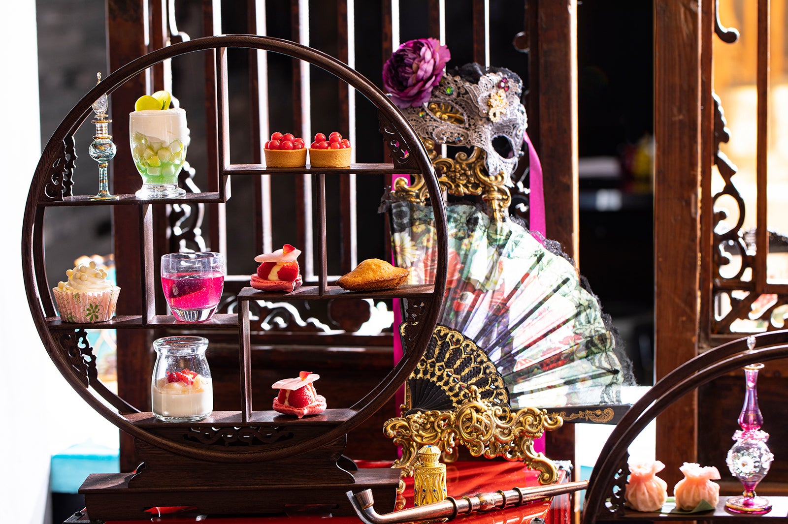 高貴な紫を基調に、仮面や香水などを用いてマリー・アントワネットの世界観で装飾されたワゴンには、フレッシュの巨峰入りラベンダー風味のジュレ「アメティスト」や、シャンパン風味のムースの中に赤ワインで煮詰めた無花果のコンポートを忍ばせた「パスパルトゥ」、ローズの香りをまとったハート型のマカロンサンド「フランスの薔薇」はもちろん、楊貴妃が好んだライチを用いたグラススイーツも用意。