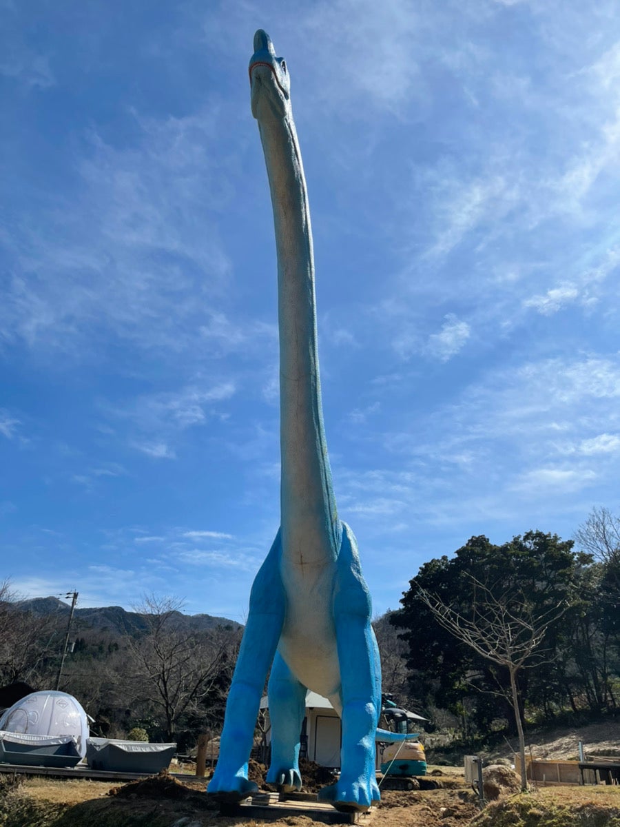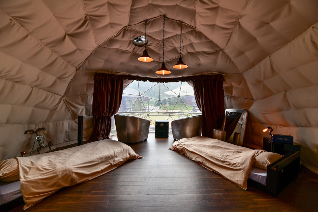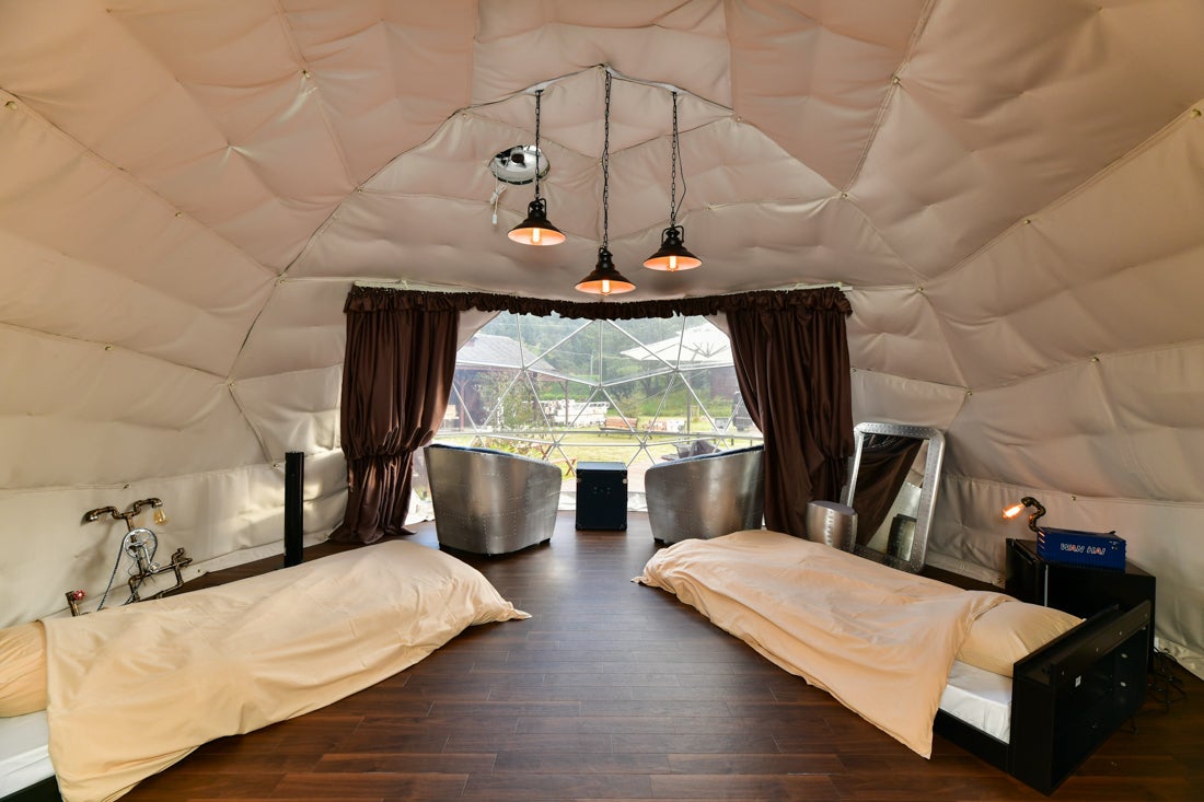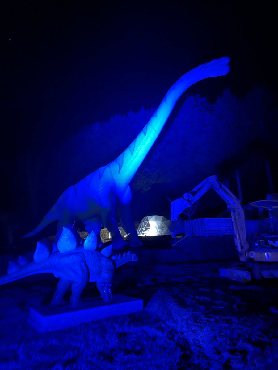 約3000坪の敷地内に、ドーム型グランピングテント5棟、BBQができる大型のスターテント、BAR、全長500mのバギーコース、ヘリポート、可動式の恐竜オブジェなどを整備した、大人から子どもまで楽しめるグランピング施設。