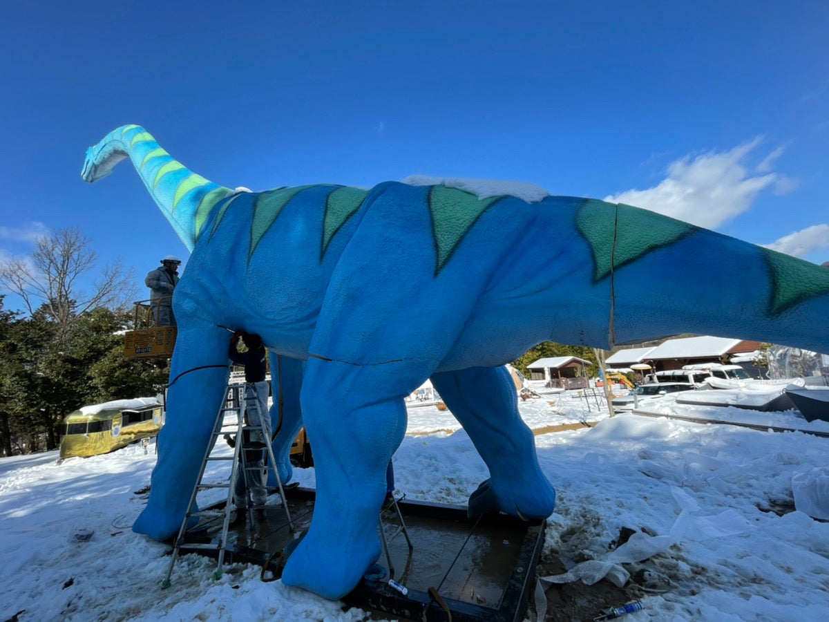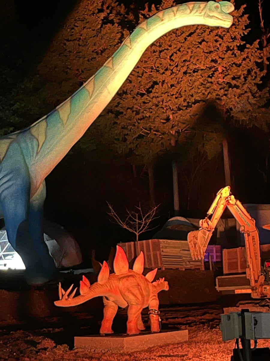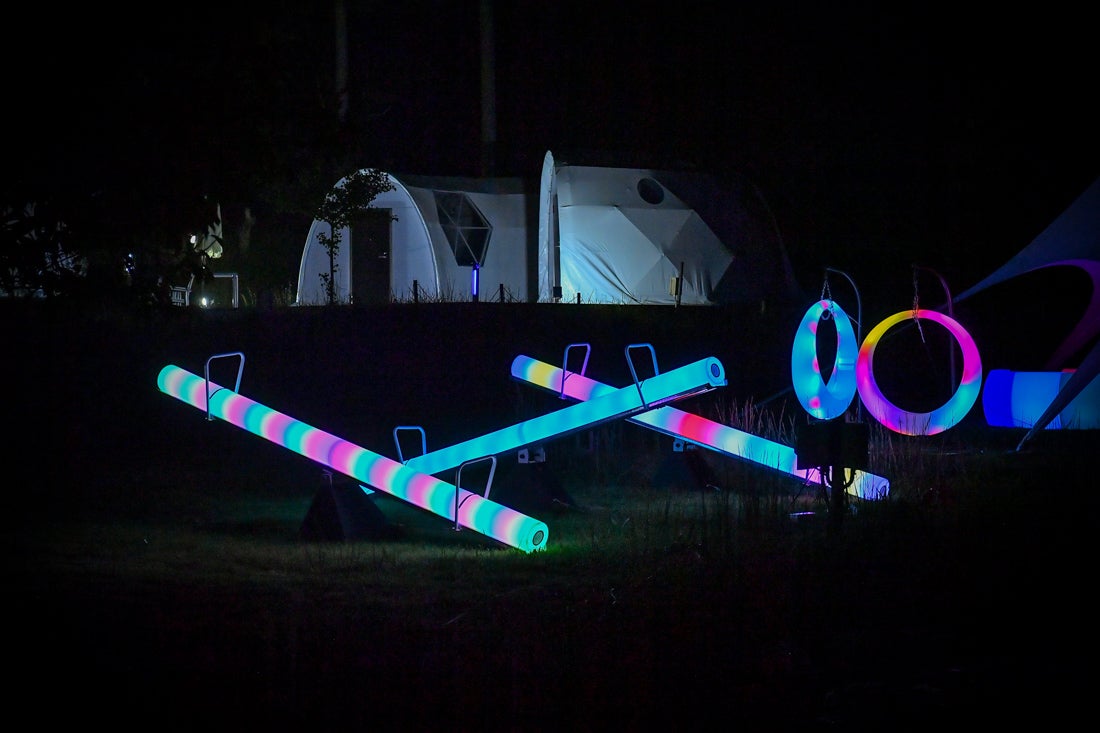 約3000坪の敷地内に、ドーム型グランピングテント5棟、BBQができる大型のスターテント、BAR、全長500mのバギーコース、ヘリポート、可動式の恐竜オブジェなどを整備した、大人から子どもまで楽しめるグランピング施設。