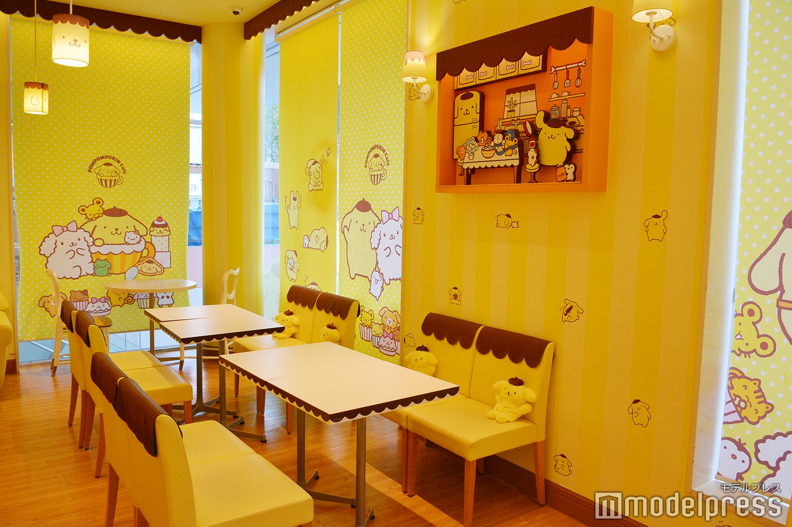 店内に足を踏み入れると、ポムポムプリンをイメージしたオリジナルの衣装に身を包んだメイドさんが、ベルの合図に合わせ、カフェにちなんだ掛け声と共にキュートにお出迎えしてくれます。内装はイエローとブラウンのプリンカラーが基調で、店内のどこを見回しても、ポムポムプリンの姿でいっぱいのデザイン。