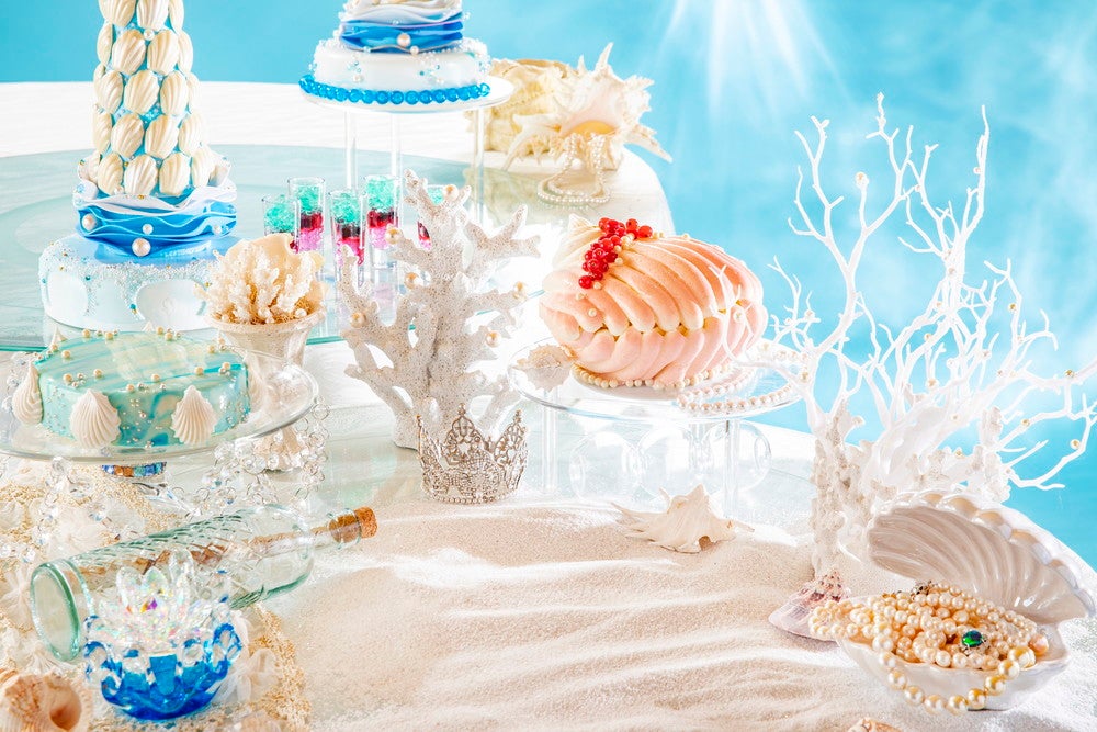 「クリスタル・マーメイドinホワイトラグーン」は、どこまでも澄み切った青空とエメラルドグリーンの海、水面を照らす太陽の光がまるでクリスタルのような輝きを放つ神秘的な情景に現れるプリンセス・マーメイドから着想を得たスイーツビュッフェ。