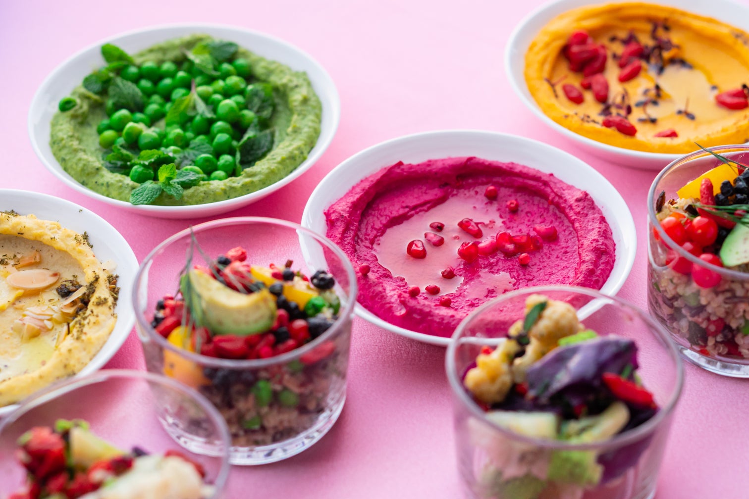 フムス、ニンジンのフムス、ビーツのフムス、グリーンピースのフムス、ローストペッパーのフムス、スーパーグレインサラダ、彩りカリフラワーサラダ、トスカーナサラダ、タワーガーデンサラダ、ニョッキアラソレンティーナ、ヤンニョムチキン フライドチキン 甘辛ソース和え、カリフラワーのグリルとザジキソース、ビーフパイ、スイートポテトとニンジン、タイ風 シーフードイエローカレー