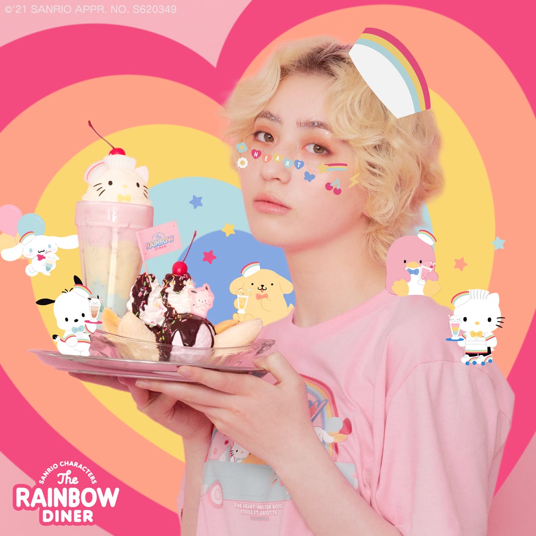 本カフェではディアダニエル、ポムポムプリン、ポチャッコ、タキシードサム、シナモロールの5キャラクターにスポットを当て、ウエイターに扮したキャラクターたちが一生懸命働く『アメリカン・ダイナー』をテーマに、ベーグルサンドボックスやメープルチキンなどのアメリカンなメニューを提供する。看板メニューは「レインボーベーグルサンドBOX」。生ハムやクリームチーズを挟んだマーブルカラーの可愛いレインボーベーグルのサイドにクラムチャウダーとポテトを添えた1品だ。