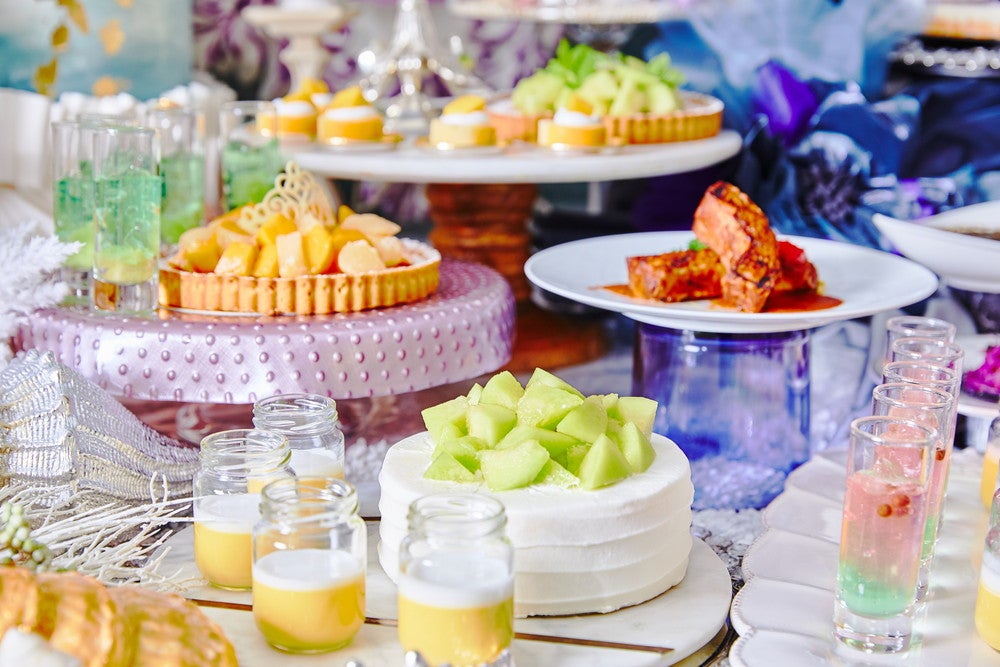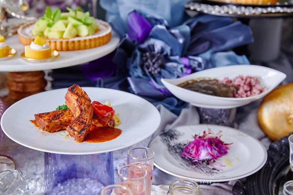 王子様に恋をして人間になるため、魔女と契約を交わし声を奪われてしまった人魚姫。「ブラック マーメイド~魔女の誘惑~」は、そんな恋する高揚感と、魔女の誘惑に陥ってしまう人魚姫のストーリーをスイーツで表現したビュッフェ企画。ビュッフェボードには、甘く芳醇な香り広がるメロンのショートケーキやタルト、ジューシーで濃厚な味わいのマンゴーのプリンやロールケーキなど、夏が旬のトロピカルなケーキの他、魔女の世界をイメージしたピーチムースや、レアチーズケーキ、チョコレートムースなどダークなスイーツが並ぶ。