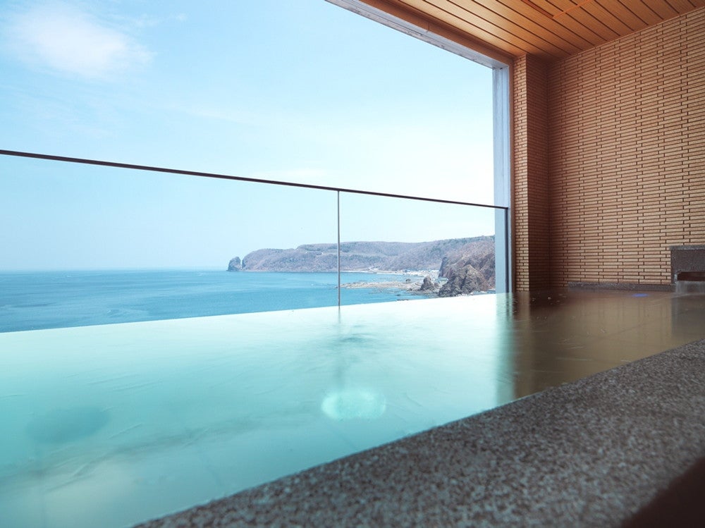 世界遺産・知床半島の観光拠点としても適した、知床中心部に位置する「北こぶし知床 ホテル&リゾート」は、景色を見ながらのんびりできる足湯や図書ライブラリーのあるラウンジ、シックなラウンジバーを有するリゾートホテル。名物のディナーブッフェは知床産の食材が中心でその品数は約50種類に及ぶ。大浴場は、展望大浴場「大海原」と露天スペース「汐音(しおん)」から成り、海と空の狭間に浮かぶような風景が疲れを癒してくれる。