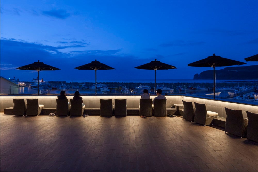 このサウナ室には、風景をパノラマで切り取る大きな窓を設置。眼下に広がるのは、世界自然遺産である知床の大自然。連なる山々と雄大なオホーツク海に、すべるように飛ぶカモメと海原はるかを行き交う漁船や観光船、そして氷点下に達する真冬には海岸に流れ着く流氷の非日常的な風景が広がり、知床での旅情を感じつつ、存分に汗を流してリフレッシュできる。